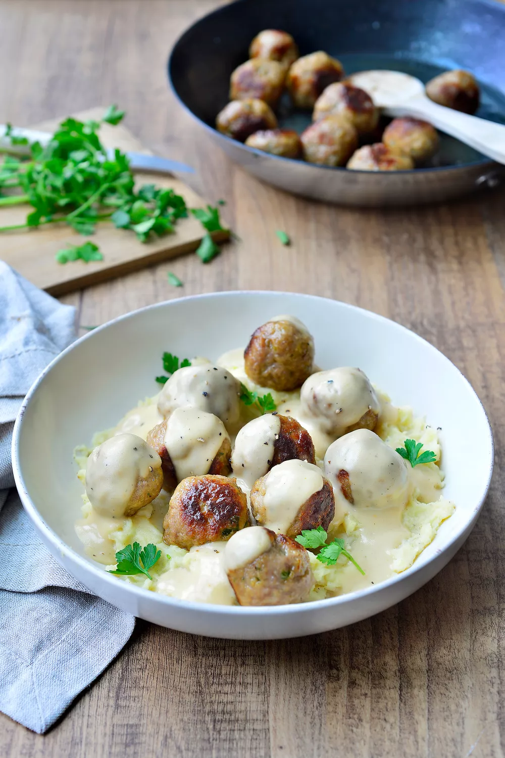 Zweedse gehaktballetjes in een romige saus met mosterd en worcestershiresaus, op smaak gebracht met piment en sjalotjes en geserveerd bij fluweelachtige puree, bieden pure comfortfood. Krokant gebakken balletjes van rundgehakt met paneermeel en peterselie worden omlijst door een roux van boter en bloem en afgewerkt met rundsbouillon en room. Perfect voor een gezellig familiediner in de herfst en winter of als troostmaaltijd na een drukke dag.