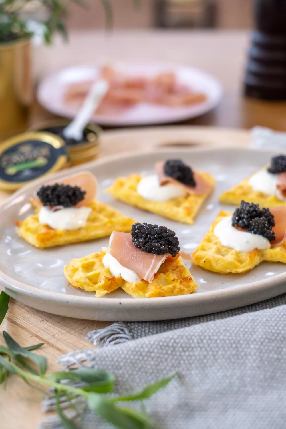 Deze luchtige aardappelkaaswafeltjes combineren knapperige textuur met romige mozzarella en dragoncrème van zure room, afgetopt met Italiaanse ham en een lepeltje kaviaar voor een feestelijk contrast. Rasp en pers de aardappelen en bak het beslag goudbruin in een wafelijzer voor extra bite. Ideaal als luxe borrelhap of verrassend voorgerecht bij brunch en diner.