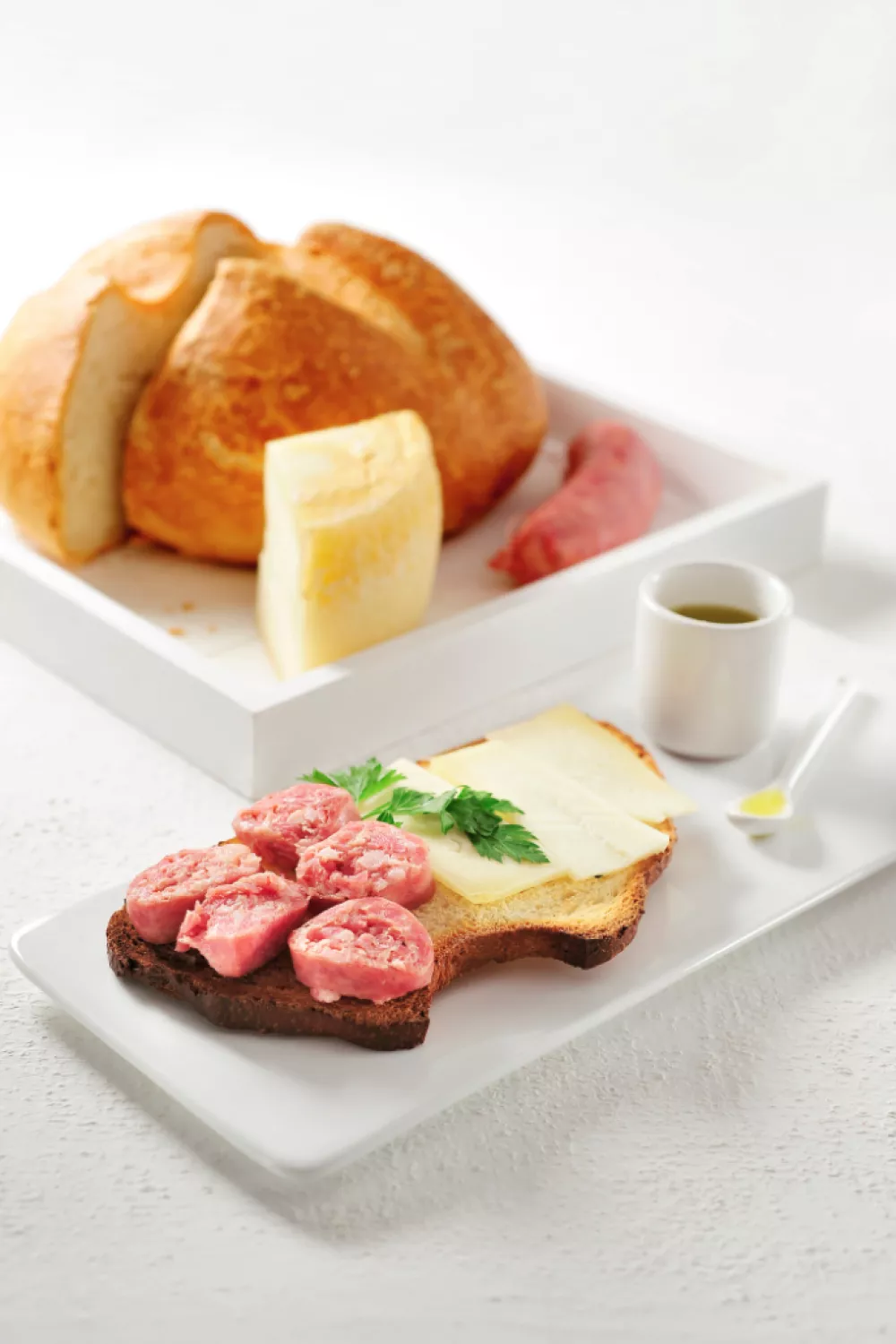 Serveer het brood met pecorino en salsiccia en werk af met schijfjes tomaat. Besprenkel met olijfolie en breng op smaak met oregano, basilicum en peper.