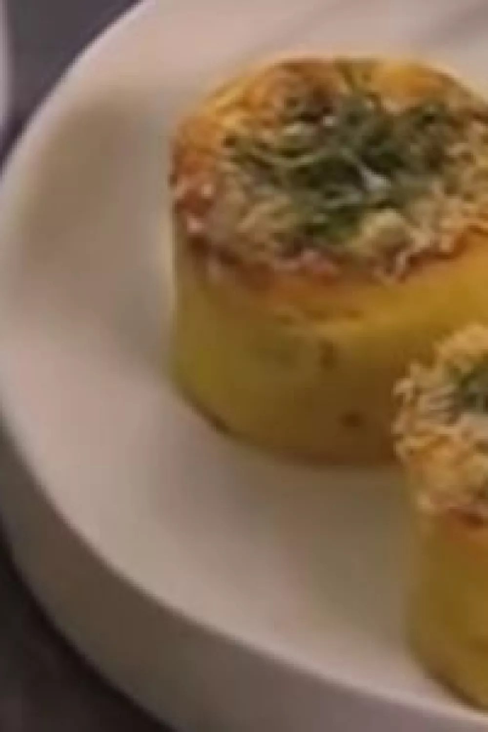 Vul de dresseerringen met laagjes aardappel, een lepel van het beslag en de Parmezaanse kaas. Herhaal tot de ringen helemaal gevuld zijn en eindig met een laagje Parmezaanse kaas. Bak 35 minuten in de oven.