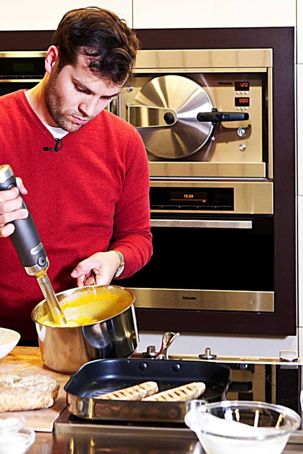 Beboter ondertussen de vuurvaste potjes. Breek in elk potje een eitje en gaar 4 minuten in de stoomoven op 90°C.