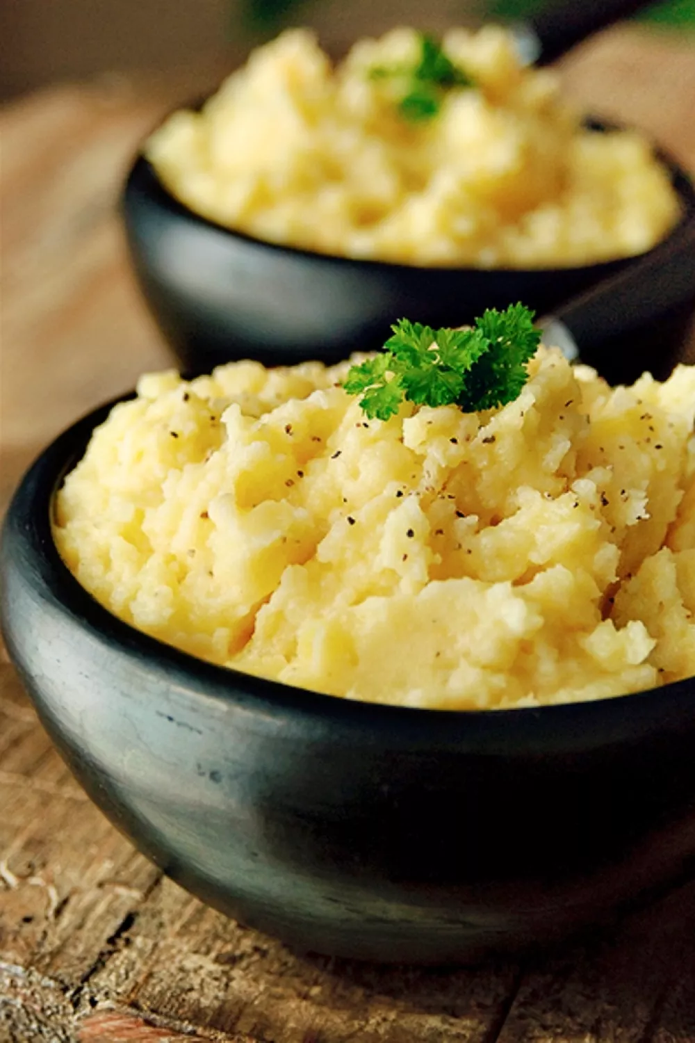 Giet de aardappelen af en laat ze even droog stomen. Stamp ze met de boter en de kaasmelk tot een romige puree. Breng de puree op smaak met nootmuskaat en flink wat zwarte peper.