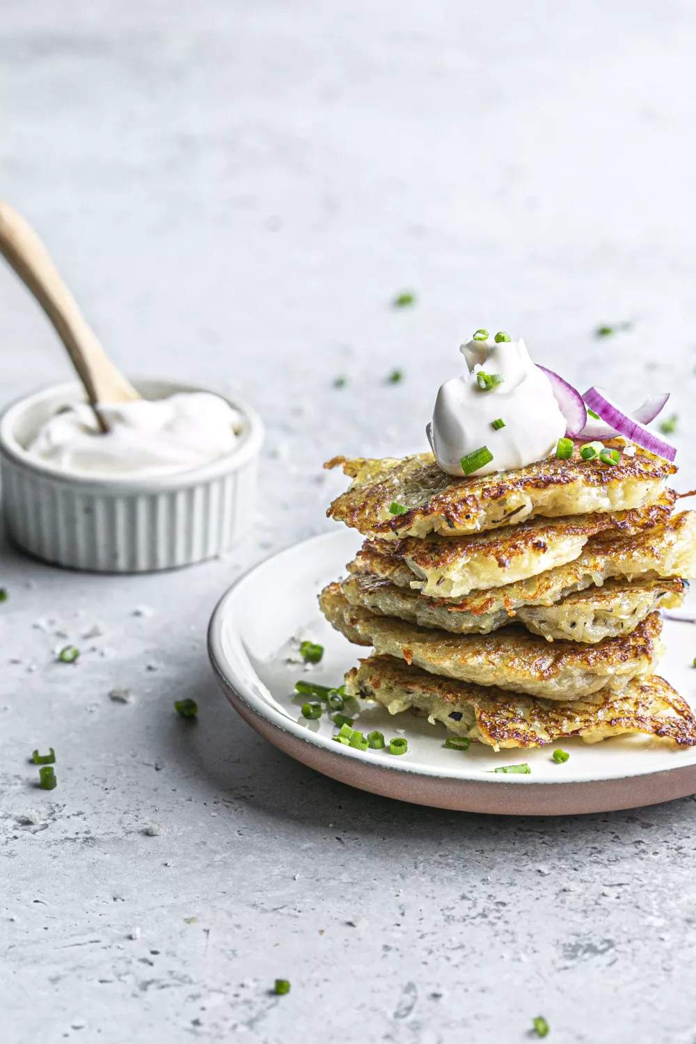 Knapperige aardappelrosti met rozemarijn en bieslook, ideaal als warm bijgerecht, borrelhapje of lichte lunch. Fijn geraspte aardappel wordt met maïszetmeel, rozemarijnpoeder en lookpoeder gemengd en in hete olijfolie in de pan goudbruin gebakken voor een krokante buitenkant en zachte binnenkant. Serveer met veganaise en rode uiringen voor extra frisheid en feestelijke smaak.