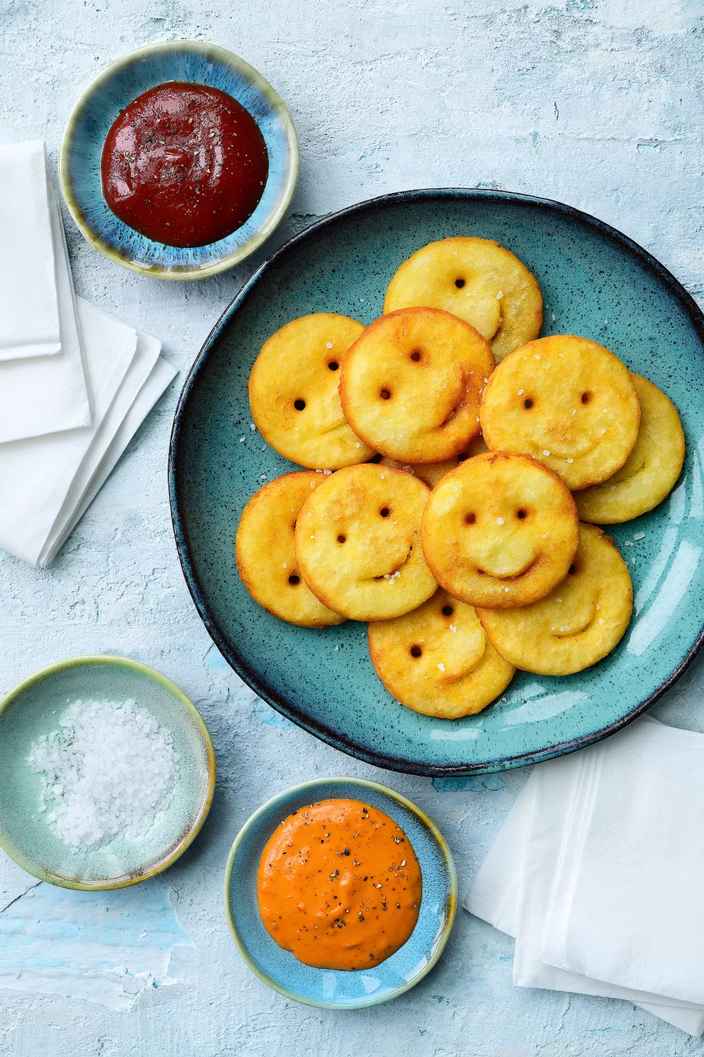 Frituur de aardappelsmileys goudbruin en krokant in de friteuse. Serveer met dipsausjes naar keuze, bijvoorbeeld barbecuesaus en andalouse.