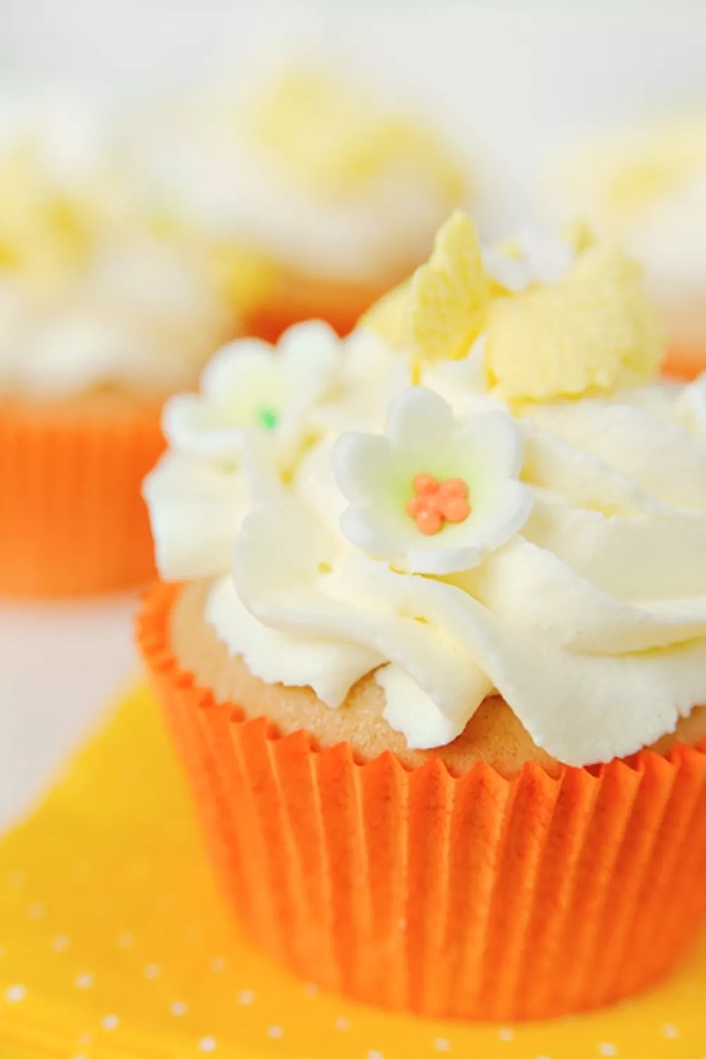 Vul een muffin tin met 12 papieren cupjes en vul deze tot 1/3 van de rand met het beslag. Bak ze gaar in een voorgewarmde oven op 175 graden in ca. 17 tot 20 minuten. Laat ze helemaal afkoelen.
