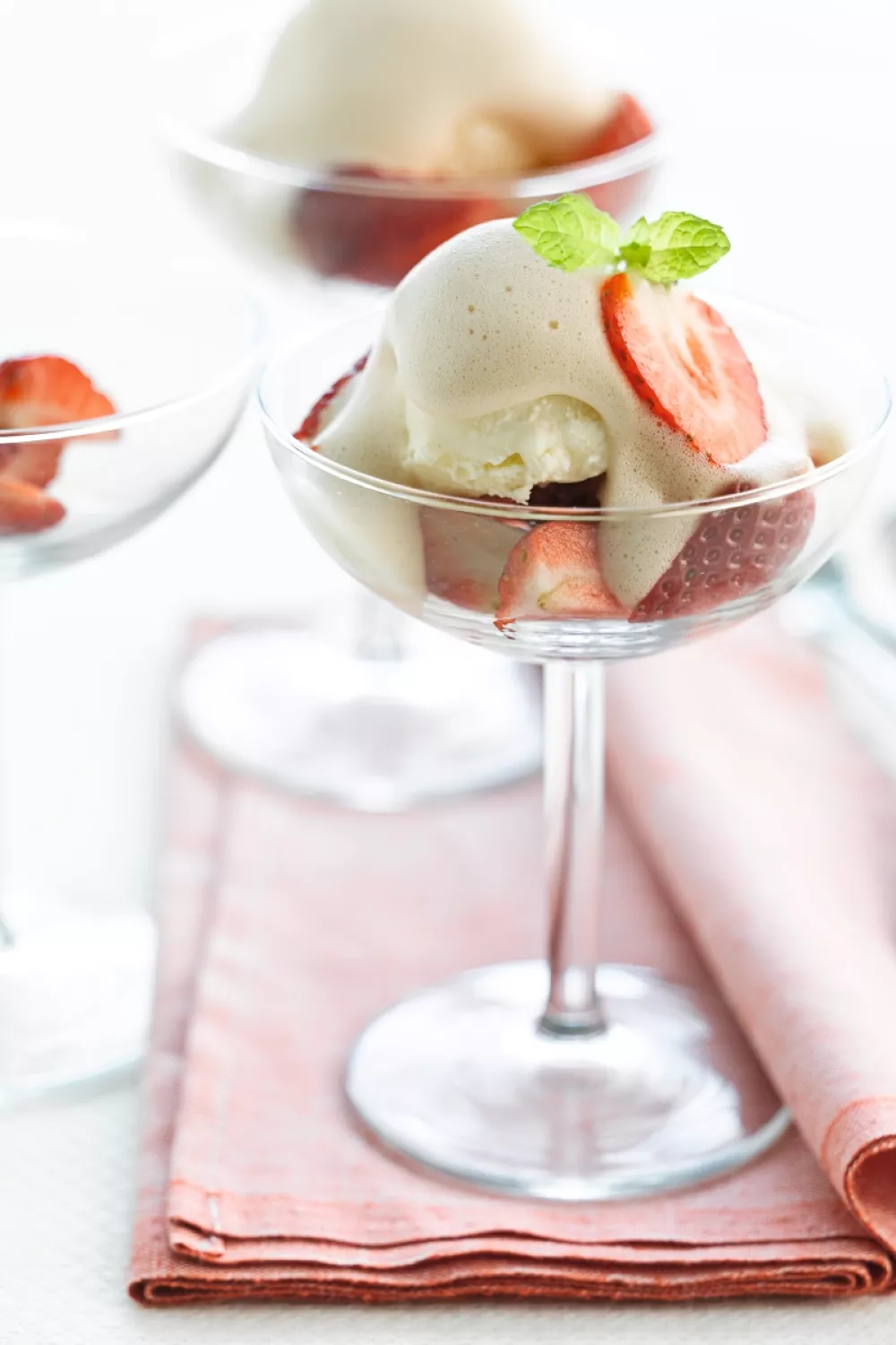 Verdeel de aardbeien over een mooi wijnglas. Leg er een bolletje vanille-ijs op en lepel de sabayon erover.