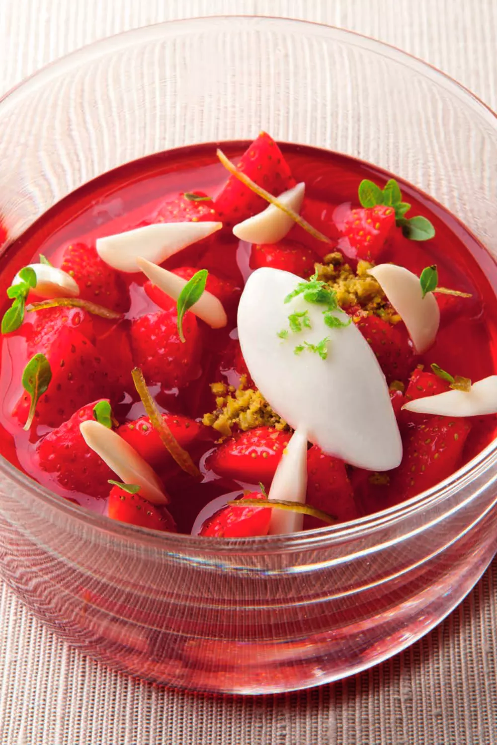 Aardbeiengelei met lycheesorbet en gekonfijte limoen