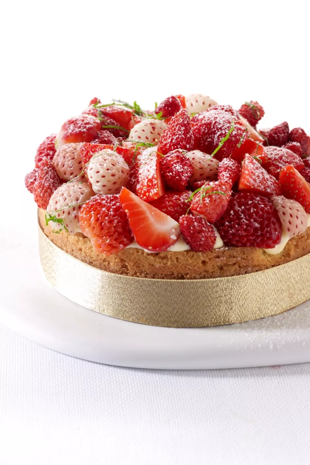 Verwijder de taartring en laat de bodem afkoelen. Spuit een laagje banketbakkersroom vervolgens op de taartbodem. Beleg de taart volledig met aardbeien en werk af met fijngesneden muntblaadjes en wat poedersuiker.
