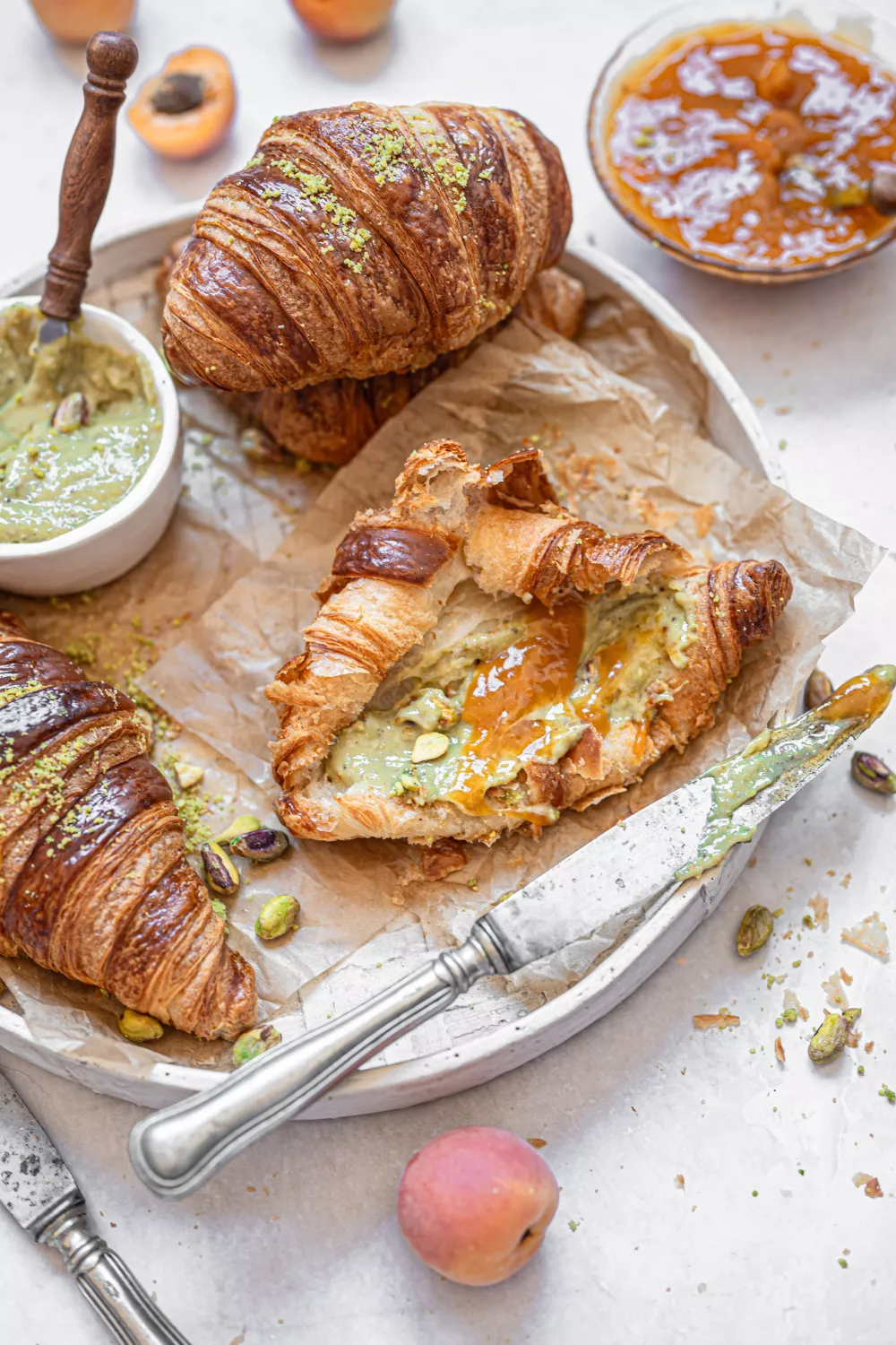 Serveer de croissants met de pistachecreme en abrikozen confituur.