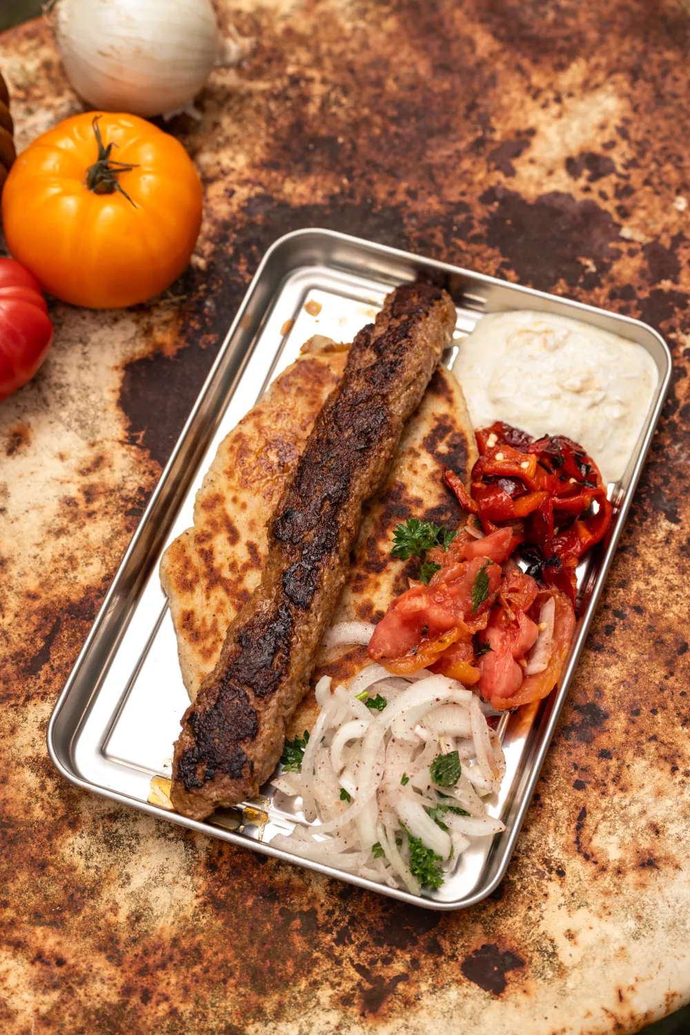 Sappige Adana kebabs van lams en rundgehakt, gegrilde puntpaprika en coeur de boeuf tomaten op huisgemaakte flatbreads met romige knoflookyoghurt en mediterrane kruiden. Ideaal voor zomerse barbecueavonden of een informele maaltijd met vrienden, het vlees wordt rond spiesen gevormd en gegrild terwijl het brood snel wordt gebakken. Gerookt paprikapoeder, ras el hanout en za'atar geven diepte, munt en citroen zorgen voor frisse tegenwicht.