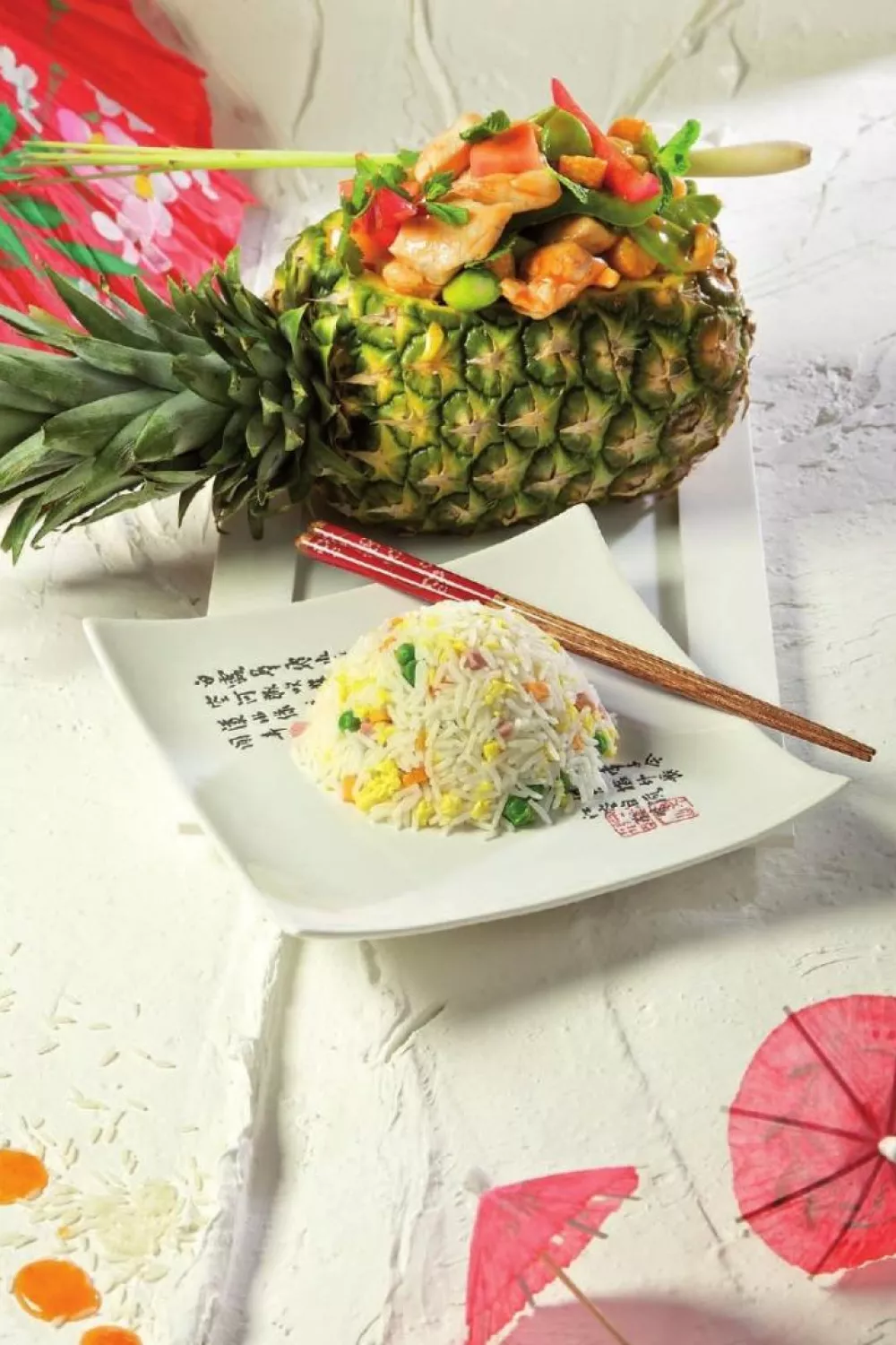 Ananas met zuurzoete groentjes en nasi goreng