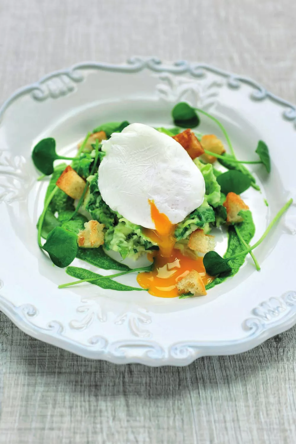 Romige andijviestamppot met boterachtige bloemige aardappelen en een zacht gepocheerd ei krijgt een frisse twist van een heldere coulis van postelein en knapperige zuurdesembroodcroutons. De bereiding combineert klassiek stampen met het verfijnde pocheren van eieren en het kort blancheren van postelein voor kleur en smaak. Perfect als troostrijk doordeweeks hoofdgerecht in herfst en winter of als feestelijke, smaakvolle maaltijd voor etentjes.