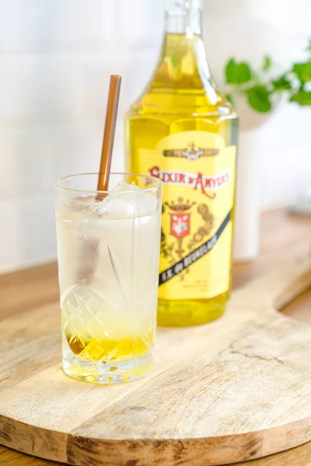Schenk er de Elixir d’Anvers en het limoensap over.
