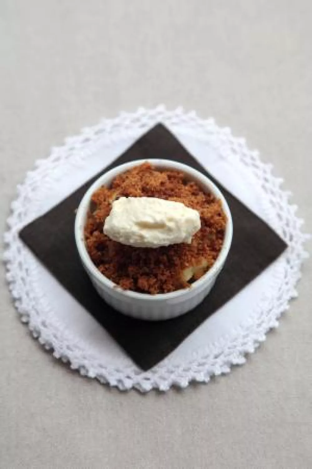 Mix in de keukenrobot de peperkoek, speculaas en bloem samen met wat boter. Verdeel het kruim over de potjes, plaats ca. 10 min. in de oven op 180°C.