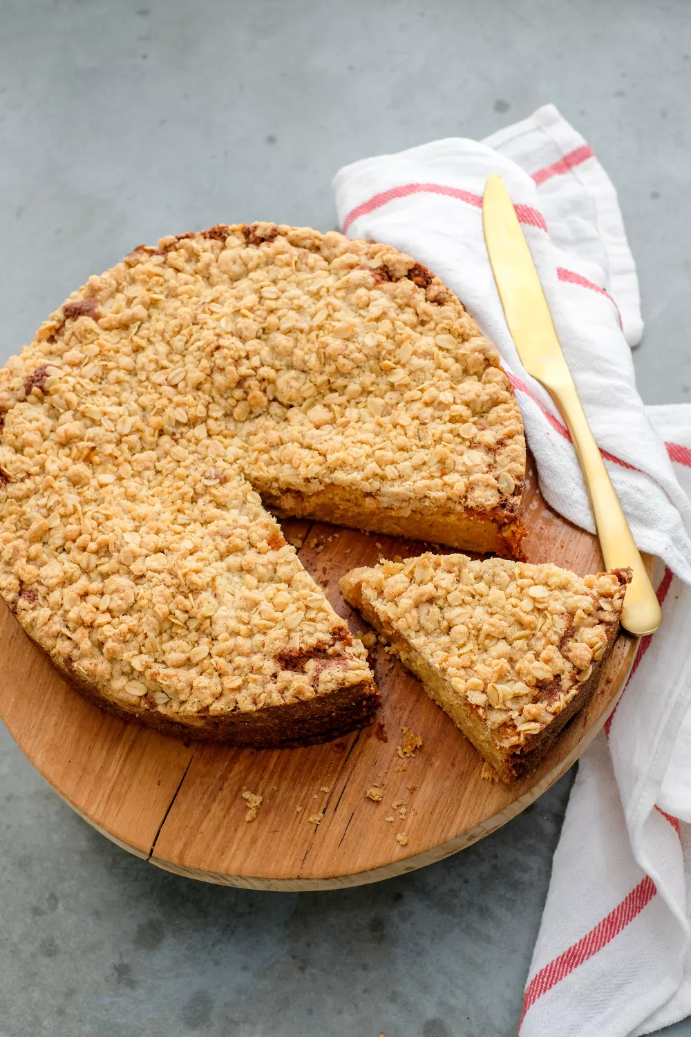 Start het met maken van de crumble. Doe de koude boter, bloem, suiker, havervlokken, zout en kaneel in een grote kom en meng het met je handen tot een crumble. Plaats de crumble in de koelkast en maak ondertussen de cake.