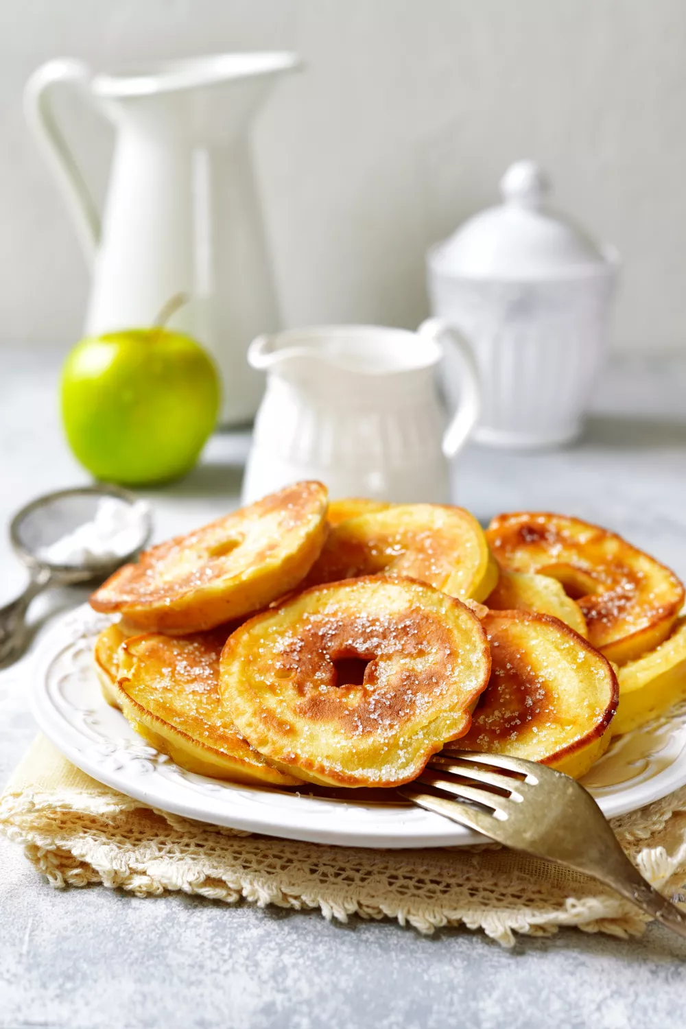 Zachte yoghurt en eieren maken deze appelpancakes heerlijk smeuïg, terwijl de buitenkant krokant goudbruin bakt in boter. Dunne appelplakjes worden in een simpel bloem-yoghurtbeslag gedipt en snel in de pan gebakken tot een feestelijk ontbijt of herfstige brunchgerecht. Bestrooi met bloemsuiker voor een klassieke zoete afwerking.
