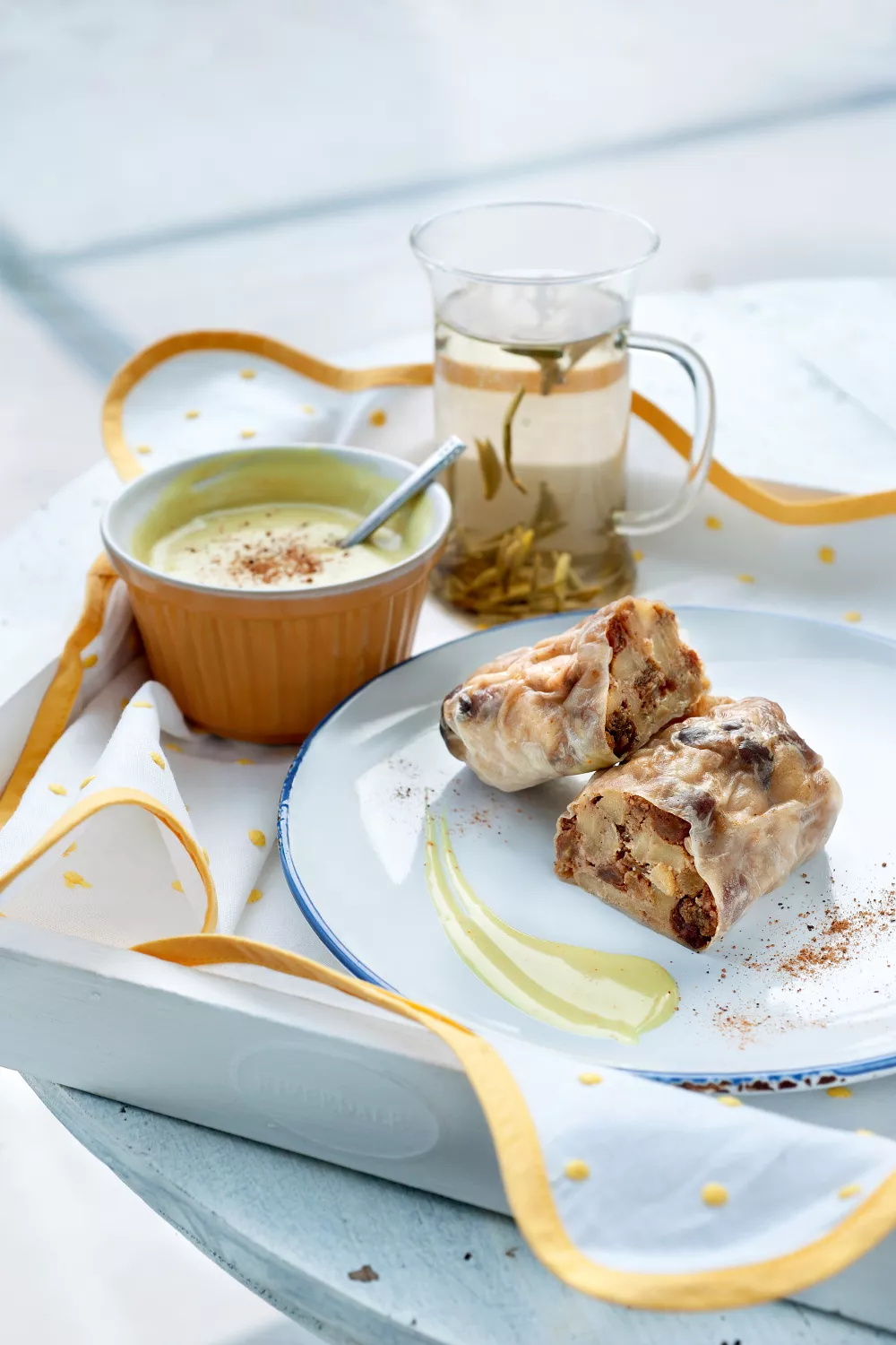 Haal de appelstrüdelrolletjes uit de oven en serveer ze met de vanillesaus.
