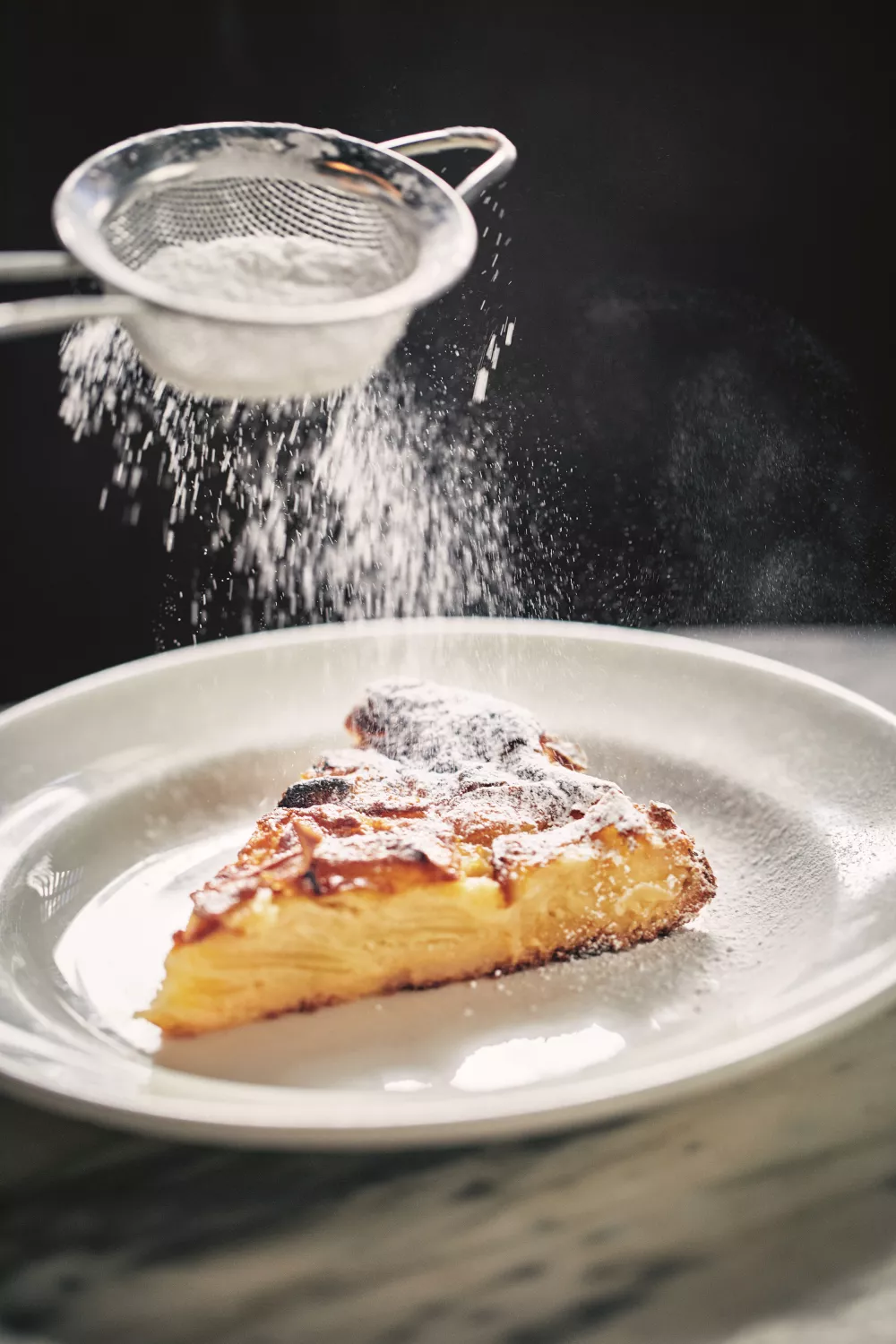 Zet de vorm 10 minuten in de oven, verlaag de temperatuur naar 180 °C en bak de taart nog 40 minuten. Haal de goudbruine taart eruit en laat minstens 30 minuten in de vorm afkoelen voor je hem op een groot taartbord zet. Bestuif vanaf enige hoogte met behulp van een zeefje met de poedersuiker. Serveer de taart in stukken op kamertemperatuur, met een schep vanille-ijs, maar zonder is hij ook heel lekker, bij de koffie of zelfs als ontbijt.