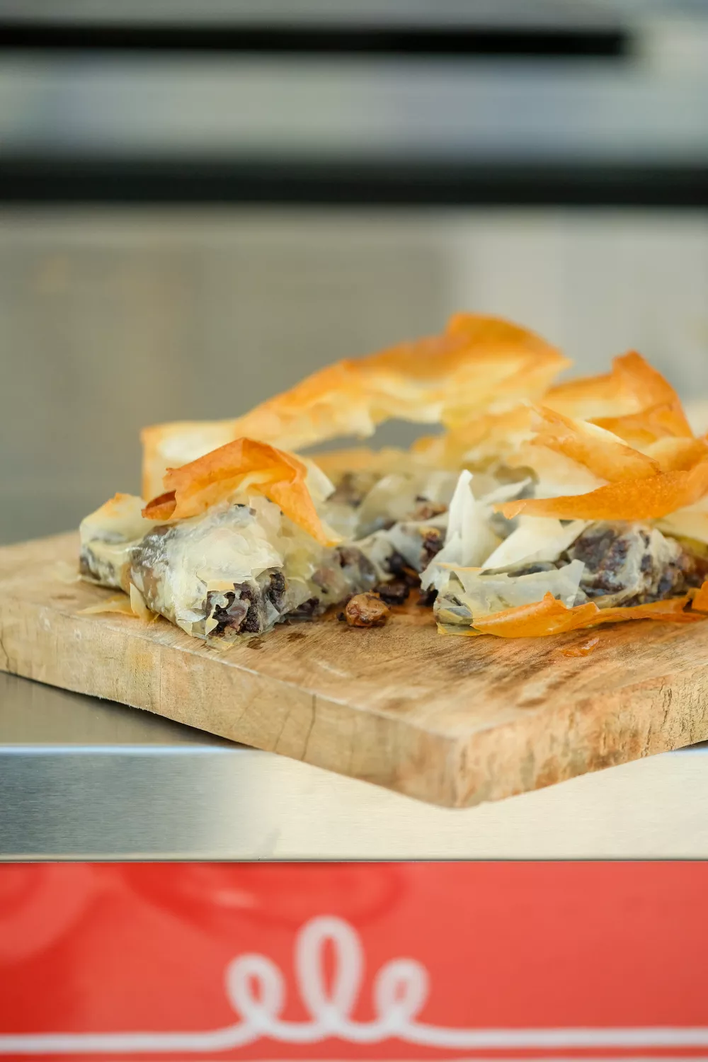 Verras je gasten met een hartige appeltaart met bloedworst en rumgeweekte rozijnen, waarin zoete appelblokjes en appelmoes samengaan met kaneel en fijngehakte noten. De vulling wordt kort gefruit en verpakt in laagjes knapperig filodeeg die royaal met boter worden bestrijkt voor een goudbruine korst. Perfect als verwarmend herfstgerecht of als origineel hapje bij een feestelijke borrel.