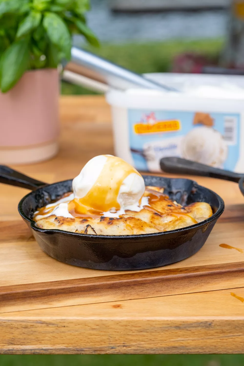 Serveer de hete cobbler met vanille-ijs en giet de resterende karamel eroverheen.