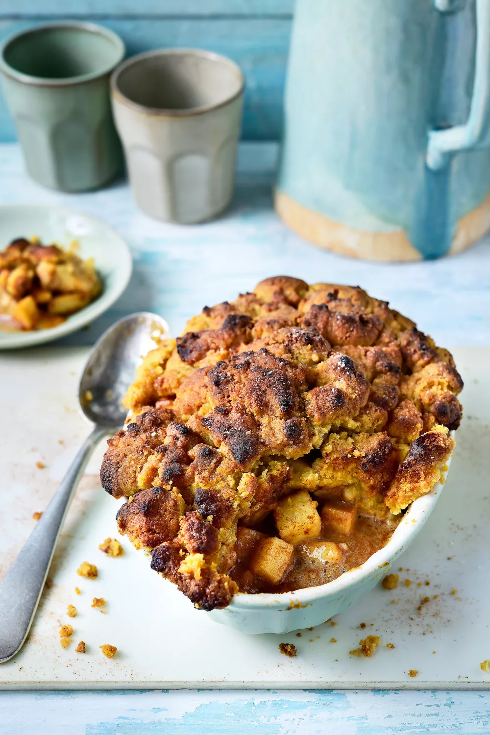 Serveer de apple crumble met nog wat extra chaisuiker of een bol ijs.
