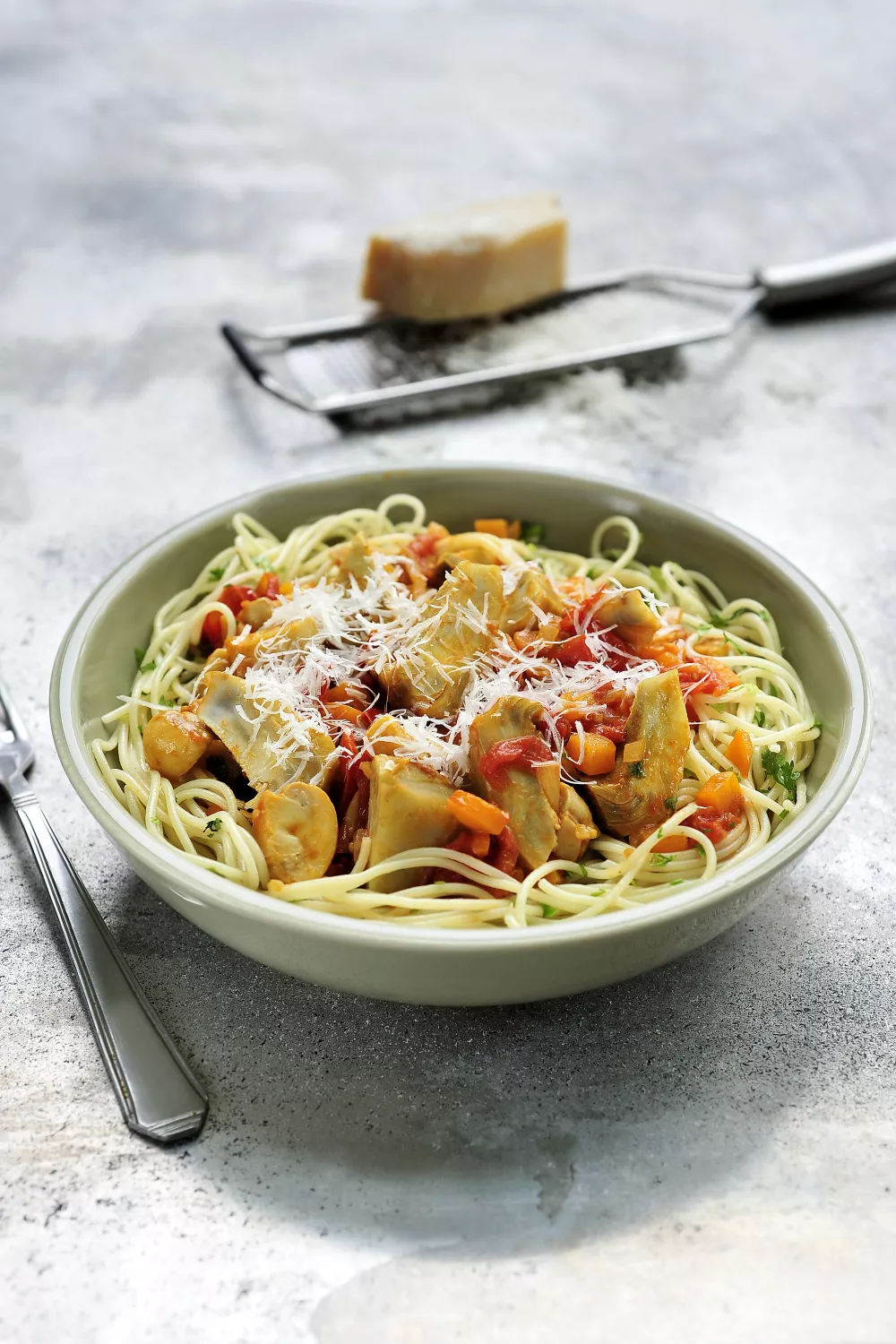 Pasta met artisjok en barigoule combineert zachte artisjokken, Parijse champignons en rijpe tomaten in een hartige witte wijnsaus met knoflook en peterselie. De groenten worden gestoofd en vervolgens geblust met wijn en bouillon zodat er een rijke, rustieke saus ontstaat die prachtig smelt met geraspte Parmezaanse kaas. Perfect als mediterraan vegetarisch hoofdgerecht voor een gezellige doordeweekse maaltijd of een informele etentje in lente of herfst.