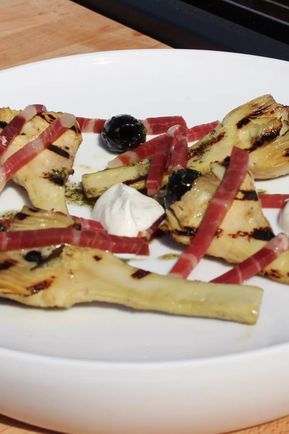 Gegrilde artisjokharten met plakken gedroogde ham en zwarte olijven brengen frisse citroen en kruidige tijm samen in een mediterraan gerecht. De artisjokken worden kort gegrild en afgemaakt met zelfgemaakte tijmolie, romige Griekse yoghurt met karwij en een frisse zeste. Licht en smaakvol, ideaal als zomers barbecue voorgerecht of borrelhap.