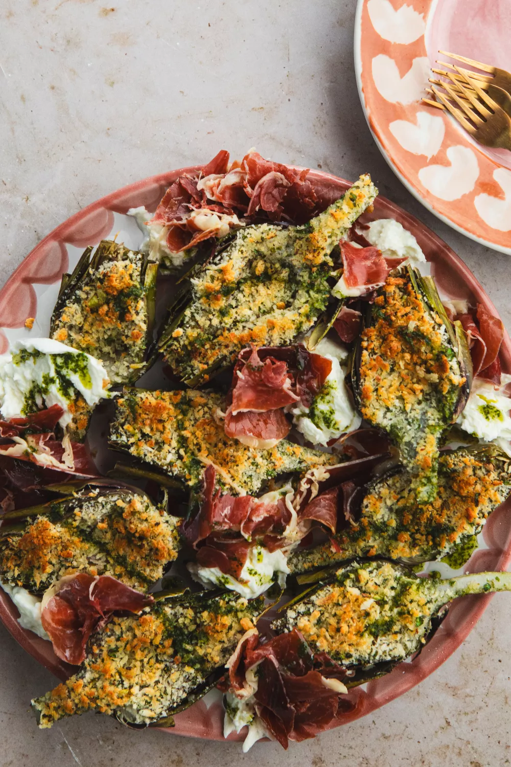 Geroosterde artisjokken met een krokant panko en Parmezaanse kaaskorstje, flinterdunne plakjes pata negra en romige buffelmozzarella brengen een mediterrane smaak op tafel. Na kort voorkoken geef je de artisjokken in de oven een goudbruine gratin zodat de panko knapperig wordt en de kaas mooi smelt. Perfect als feestelijk voorgerecht of zomers gedeeld hoofdgerecht, afgewerkt met basilicumolie voor frisse, kruidige aroma's.