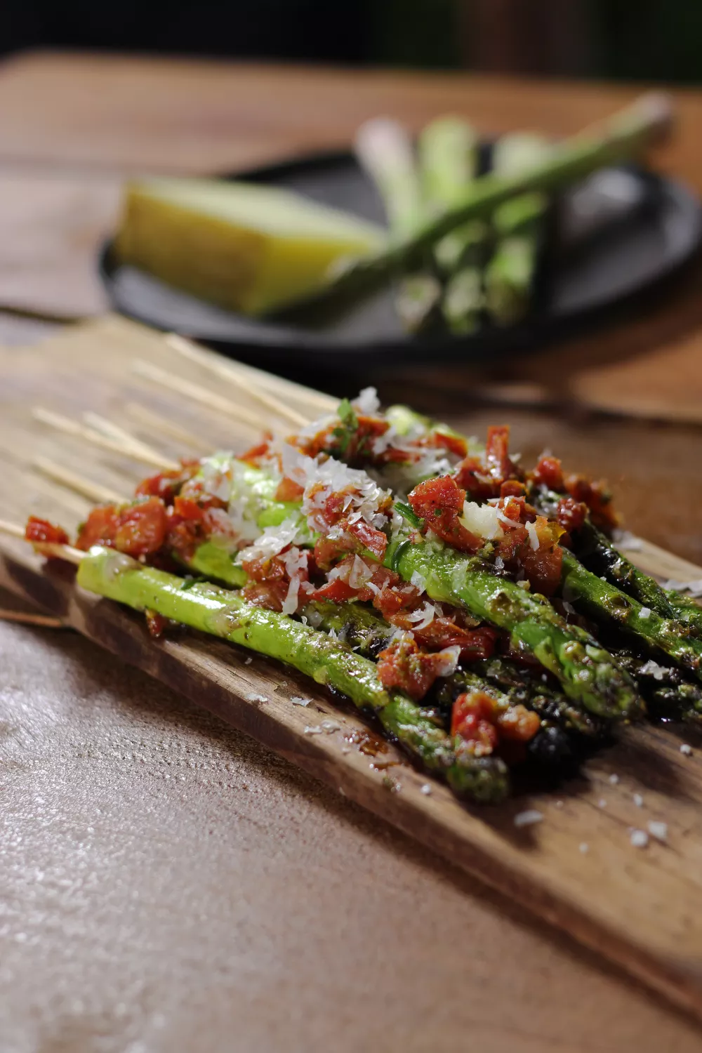 Knapperige groene asperges, op houten stokjes geregen en gegrild op de barbecue, krijgen een volle mediterrane smaak door olie van zongedroogde tomaten en fijngehakte rozemarijn. Fijne stukjes zongedroogde tomaat en geraspte manchego maken van deze brochettes een hartig zomers voorgerecht of smaakvol bijgerecht. Snel klaar en ideaal voor een zomers tuinfeest of een informele tapasavond.
