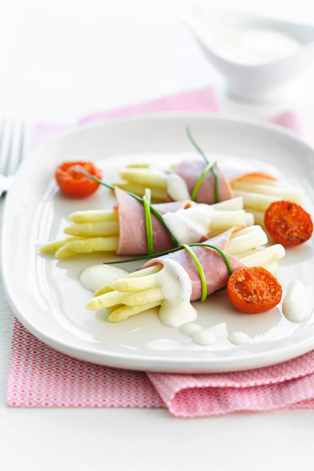 Lichte, feestelijke aspergerolletjes met Meesterlyck kookham en een romige aspergemayonaise. Knapperig gekookte witte asperges worden per drie omwikkeld met dunne ham, afgewerkt met opgeklopt eiwit in de mayonaise en snel gepofte kerstomaatjes voor een frisse zoetheid. Perfect als voor- of bijgerecht in het lenterseizoen of als elegant aperitief bij een feestelijke tafel.