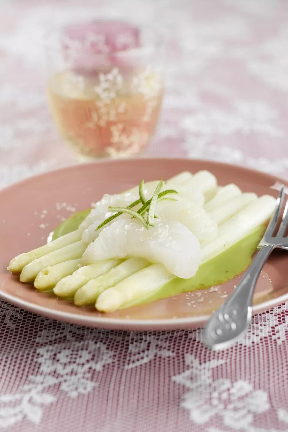Licht en elegant voorgerecht met zachte, in melk gegaarde witte asperges, frisse peterseliecoulis en flinterdunne plakjes zeebaars. De romige dressing van peterselie, olijfolie, mirin en limoen geeft een frisse, harmonieuze smaak die goed past bij lente- en zomermenu’s. Afwerking met grof zeezout en limoenrasp zorgt voor een zilt-frisse toets, ideaal als feestelijke starter of lichte visschotel.