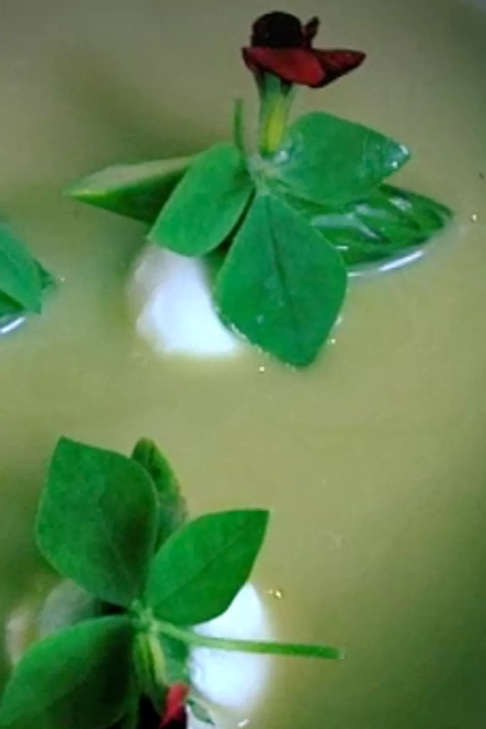 Leg in elk bord drie eitjes met daarbovenop een aspergekopje en overgiet met soep.