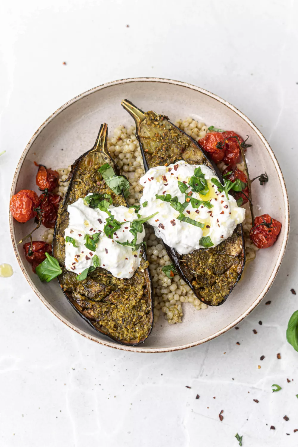 Geroosterde aubergines met volle groene pesto en romige burrata vormen een smaakvol vegetarisch hoofdgerecht dat zowel feestelijk als doordeweeks past. Zoete kerstomaatjes en parelcouscous voegen textuur en frisse accenten toe, terwijl het roosteren in de oven de smaken verdiept. Werk af met verse basilicum voor een lichte, zomerse touch.