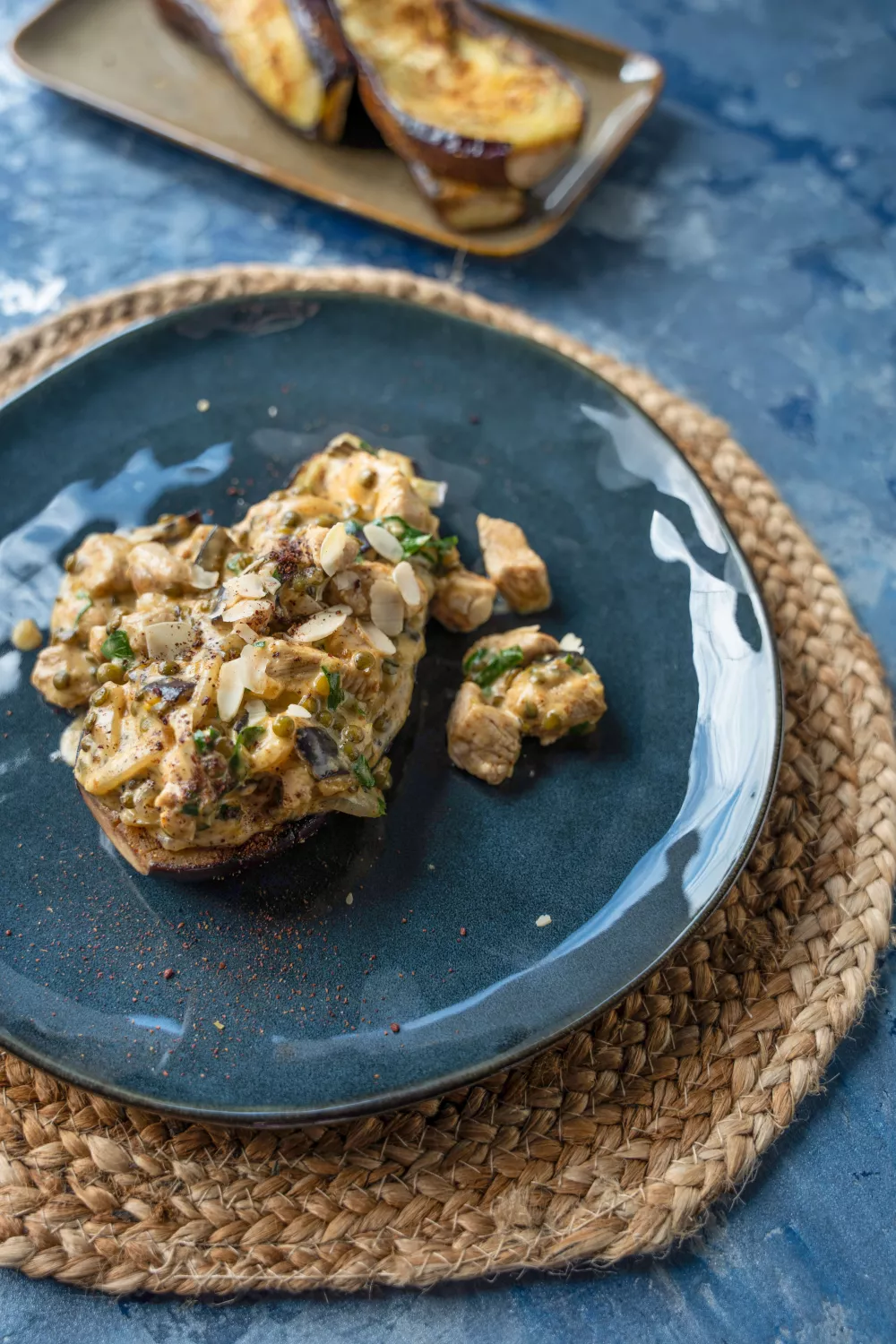 Deze auberginepizza met romige kalkoenragout combineert gegrilde aubergineplakken met aromatische Midden Oosten kruiden zoals ras el hanout en za'atar voor een verrassende, lichte maaltijd. Linzen geven hartigheid en textuur, de met bloem afgewerkte roomsaus zorgt voor fluweel en geroosterde amandelschilfers met sumac brengen een knapperig en fris accent. Perfect als zomerse lunch of als origineel diner voor liefhebbers van mediterraan en Midden Oosten eten.