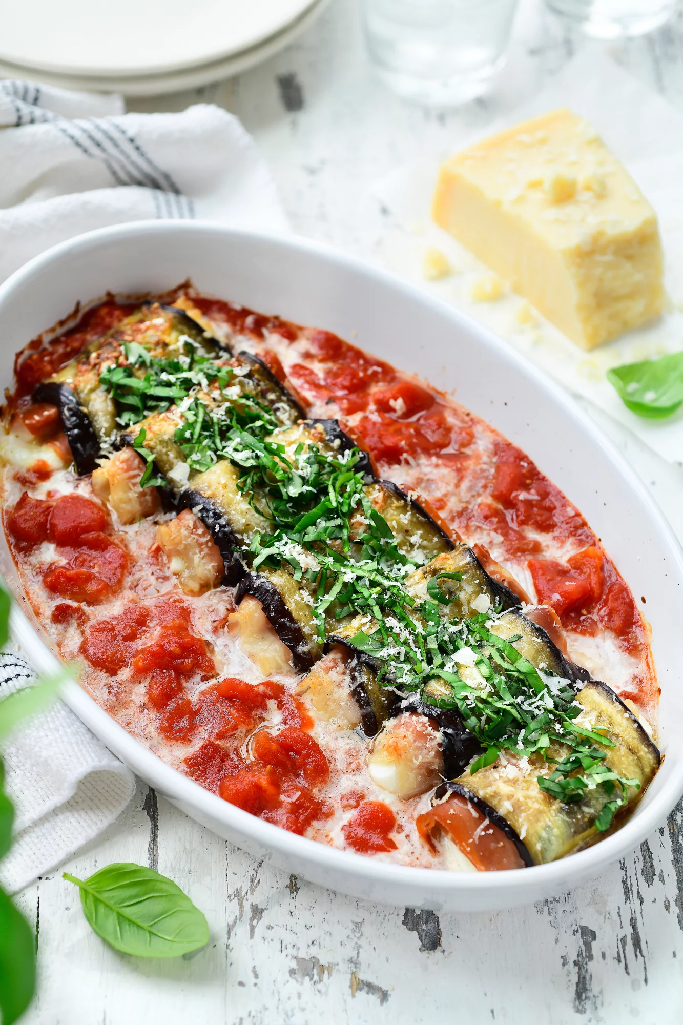 Auberginerolletjes uit de oven met romige mozzarella en Italiaanse ham zijn een smaakvol en licht hoofdgerecht, perfect voor een zomerse avond of een gezellige doordeweekse maaltijd. Dunne aubergineplakken worden eerst geroosterd, vervolgens gevuld met mozzarella en ham, strak opgerold en in een bed van tomatenblokjes gegarneerd met Parmezaanse kaas in de oven afgebakken. Werk af met verse basilicum voor een frisse mediterrane toets.