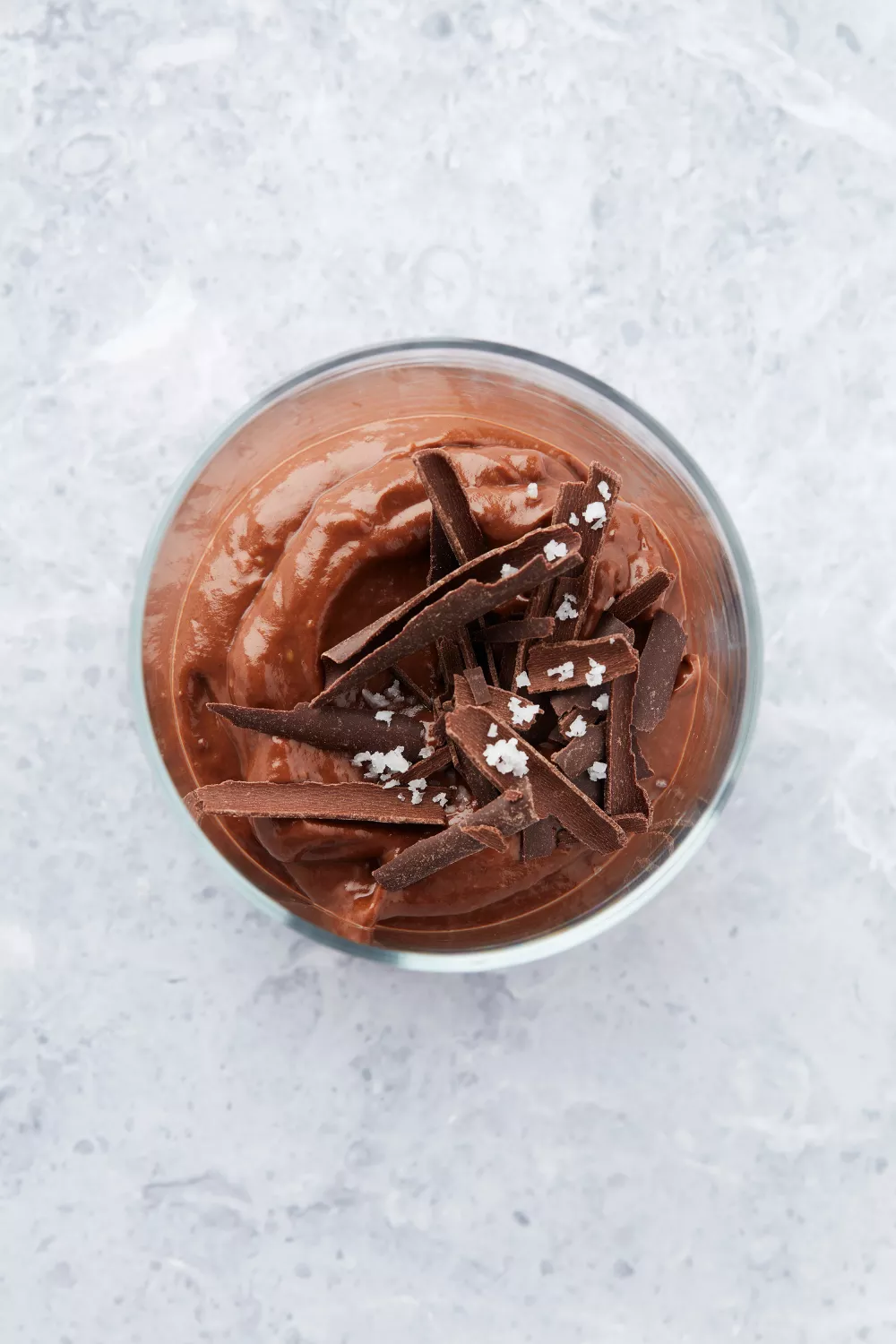 Serveer in de avocadocups of in mooie glaasjes. Werk af met de chocoladeschilfers en het zeezout.