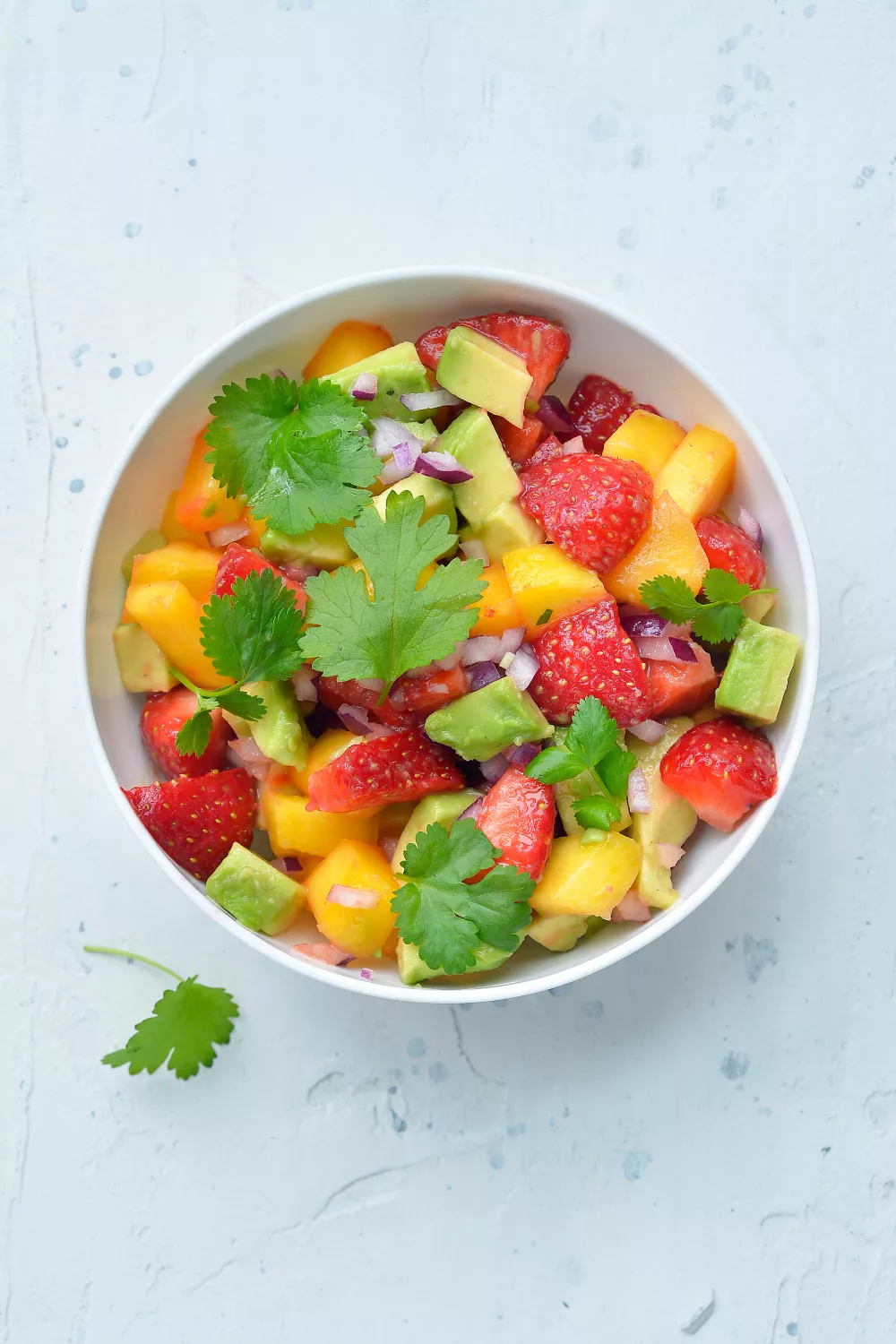 Deze frisse, fruitige salsa combineert romige avocado met zoete mango en sappige aardbeien, aangevuld met de bite van rode ui, het zuur van limoen en geurige koriander. Heerlijk als zomerse salade of dip, perfect bij de barbecue, brunch of borrel. Snijden, mengen en kort laten koelen is alles wat je nodig hebt voor een snelle, kleurrijke topping vol smaak.