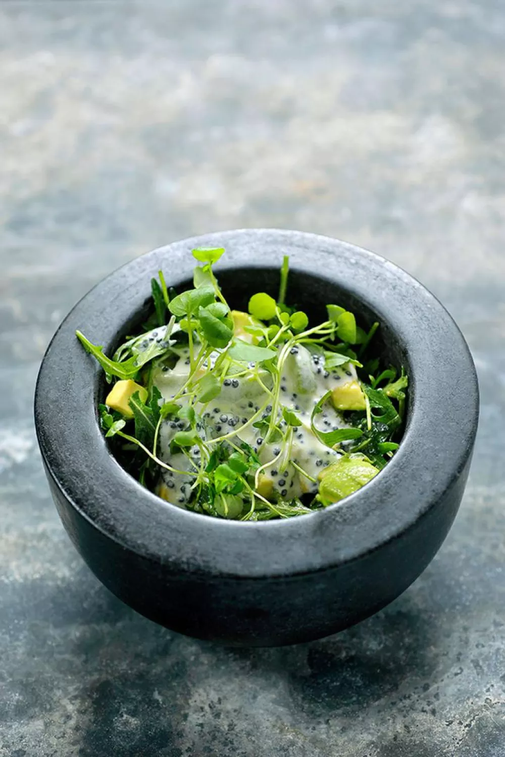 Avocadoslaatje met dressing van yoghurt en haringkaviaar
