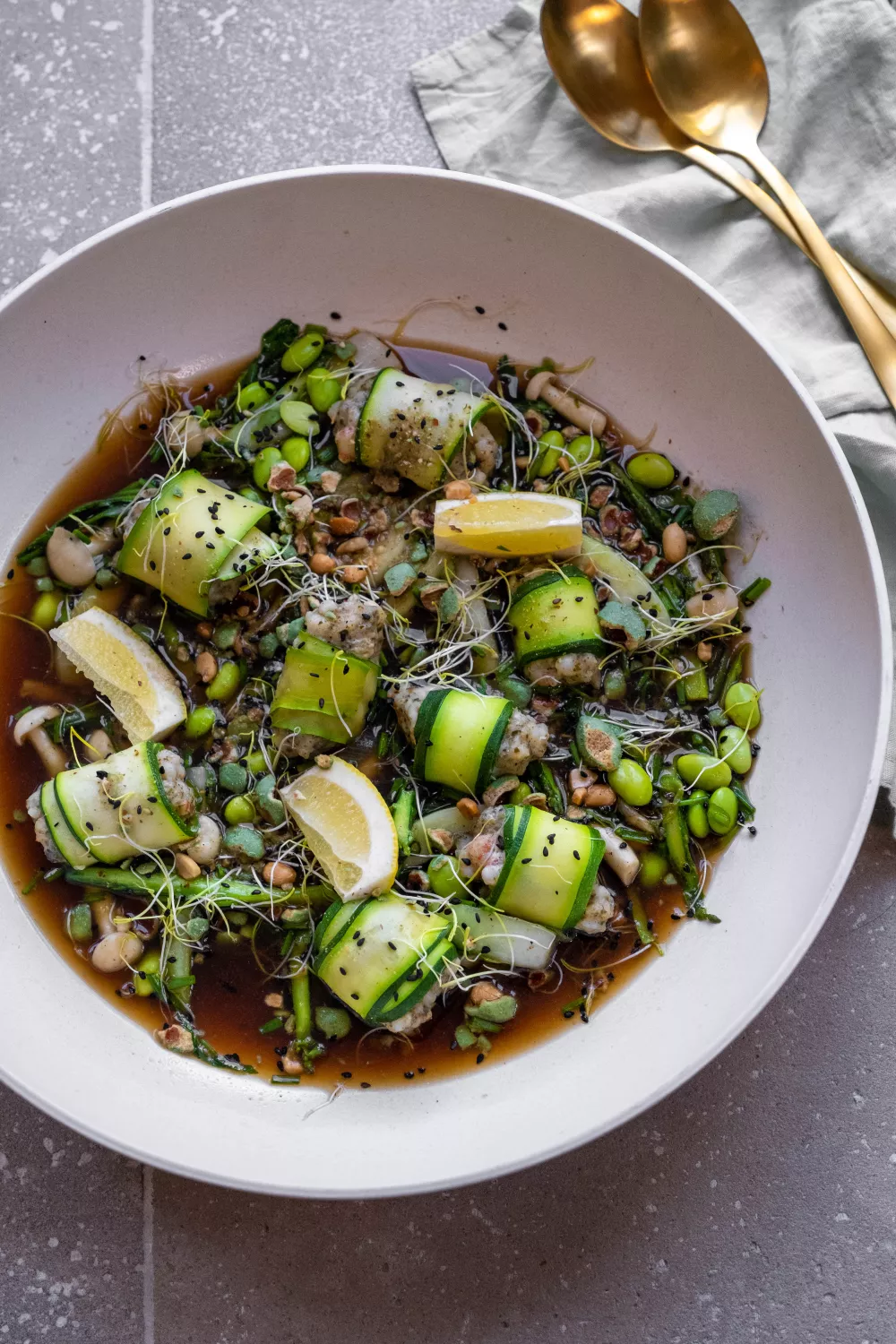 Licht Aziatisch soepje met delicate cannelloni van courgette en scampi, doordrenkt met kafirlimoen, citroengras en verse gember. De techniek combineert stomen voor malse scampirolletjes en een korte roerbak van paksoi, enoki en mini asperges voor extra knapperigheid. Een elegant voorgerecht of lichte avondmaaltijd voor lente en zomer, afgewerkt met sesam, wasabi en een partje citroen.