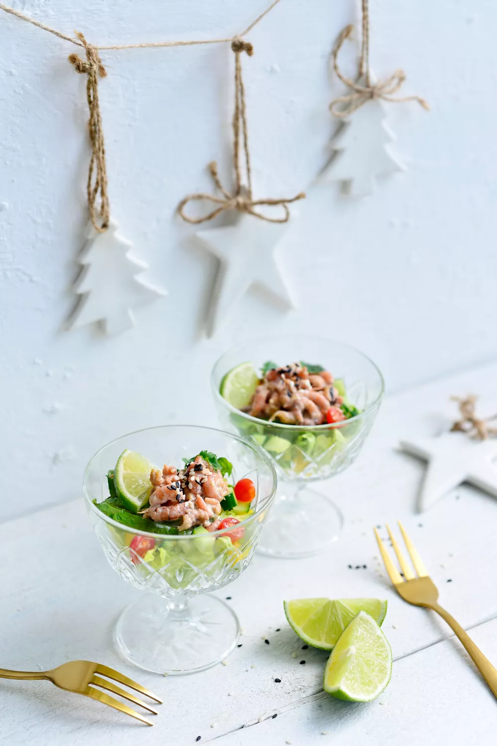 Neem kleine glaasjes en vul ze met de sla, mango- en komkommerblokjes en stukjes tomaat. Lepel er wat grijze garnalen bovenop. Werk af met wat sesamzaadjes, een partje limoen en enkele blaadjes koriander.