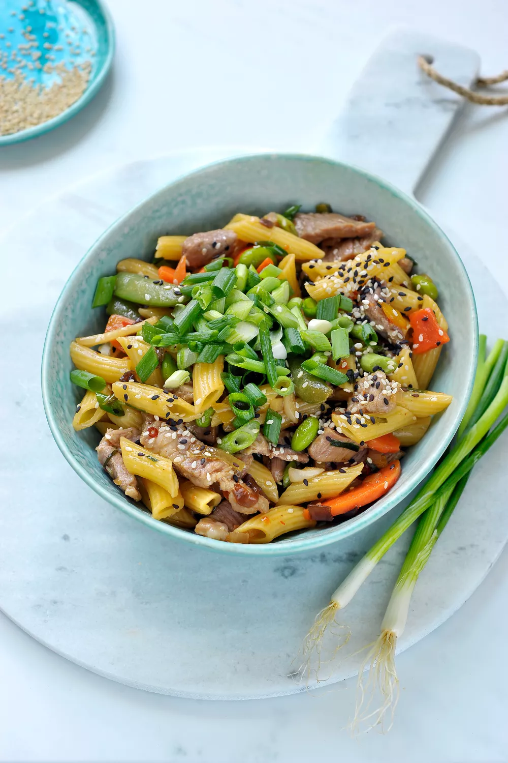 Schep de penne in een bord en werk af met fijngesneden lente-ui en sesamzaadjes.