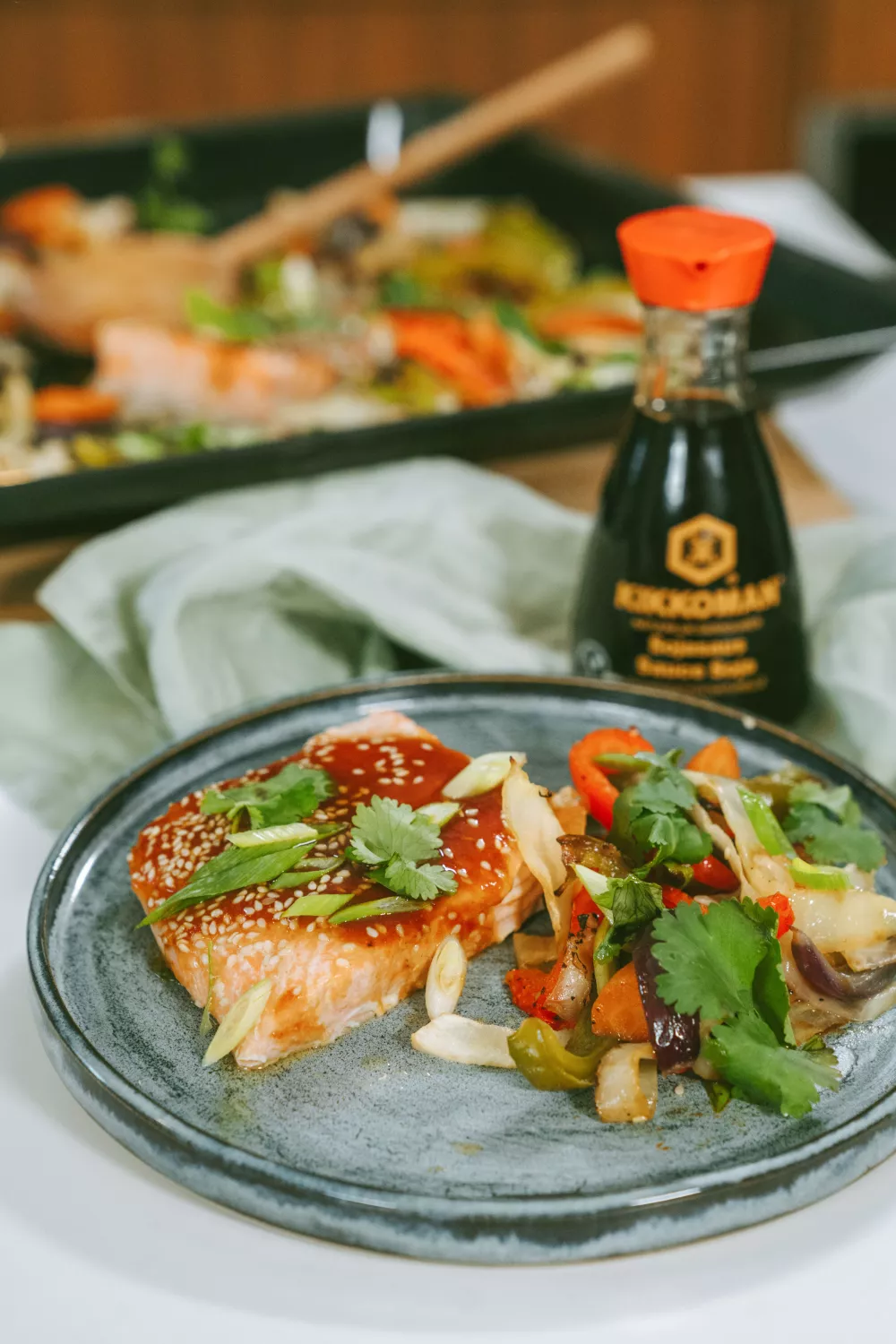 Leg de zalmfilets tussen de groenten op de bakplaat en schep op elk stuk zalm een volle eetlepel van het sausje. Sprenkel de rest van het sausje over de groenten. Strooi de sesamzaadjes boven op de zalm, verlaag de temperatuur van de oven naar 180 graden en zet de bakplaat nogmaals 10 minuten in de oven.