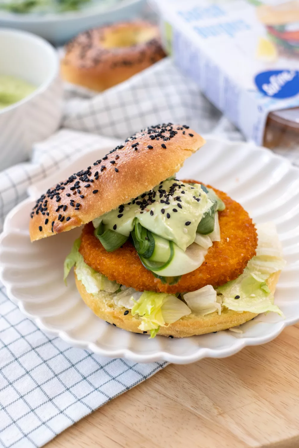 Bagel met SoFish burger, zoetzure komkommer en avocadodressing
