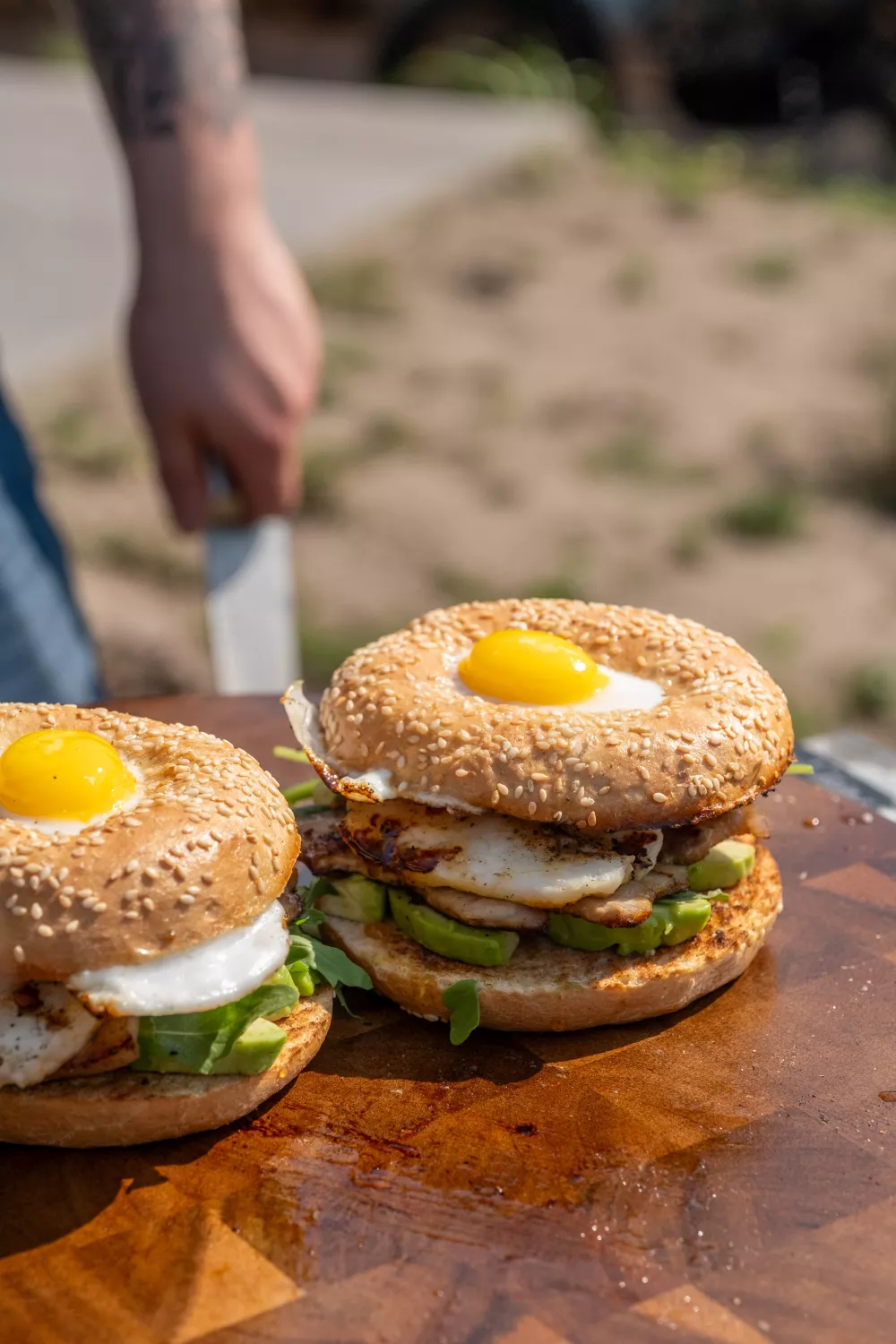 Deze hartige bagel met spiegelei, krokant spek en gegrilde halloumi combineert zoute en romige smaken met een zoet en pikant laagje van honing en chilivlokken. De bagels worden op de barbecue opgewarmd en de halloumi en spek licht gegrild en ingesmeerd met de honing, terwijl het ei direct op de bovenkant gaart voor een sappige dooier. Serveer met avocado en rucola voor een frisse brunch of zomerse lunch.