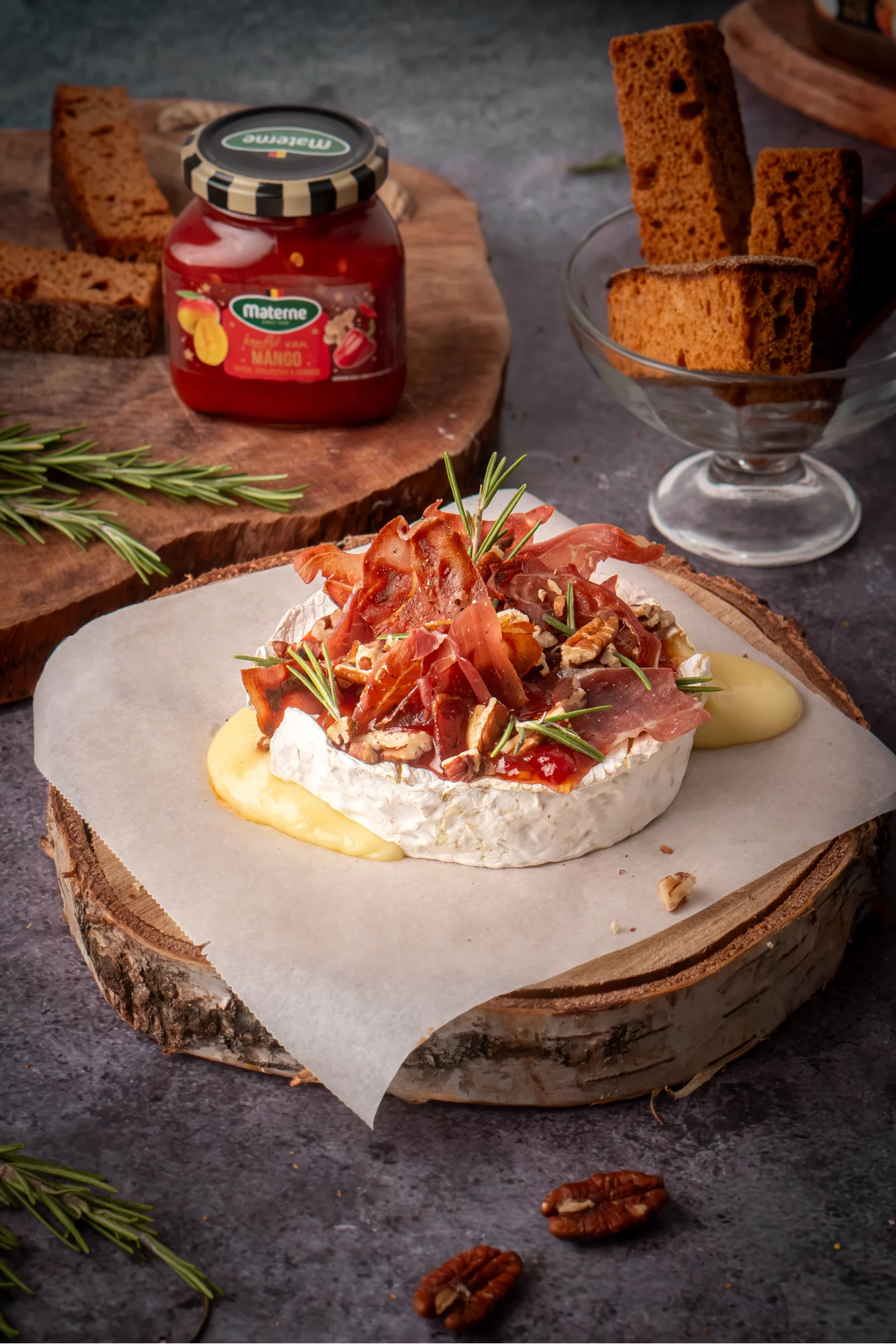 Deze baked brie met mangokonfijt is het ideale voorgerecht of aperitief voor wie houdt van romige, warme kaas met een luxueuze twist. De smeuïge brie wordt afgewerkt met zoet-pittige Materne mangokonfijt, krokante serranoham en geroosterde pecannoten. Samen met warme reepjes peperkoek vormt dit een verrassende combinatie van hartig, zoet en zacht—perfect om te delen, snel klaar en ongelooflijk indrukwekkend.