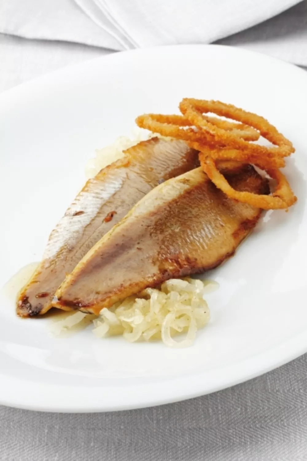 Schep wat uiensaus op het bord, verdeel de vis erover en serveer met de uiringen.