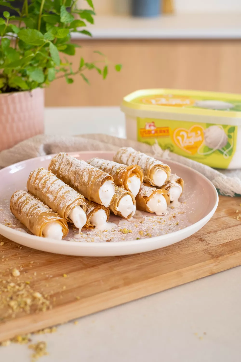 Maak met zilverpapier staafjes en draai hier een stukje filodeeg rond. Leg de rolletjes op een met bakpapier beklede bakplaat en bak ze gedurende 15 minuten in een voorverwarmde oven van 180 graden. Verwijder de zilverpapierstaafjes en laat de rolletjes afkoelen. Schep het vanille-ijs in een spuitzak met rond spuitmondje en spuit er de baklavarolletjes mee vol. Schik de rolletjes mooi op een bord, drizzle er wat vegan honing over en werk af met een laagje poedersuiker.
