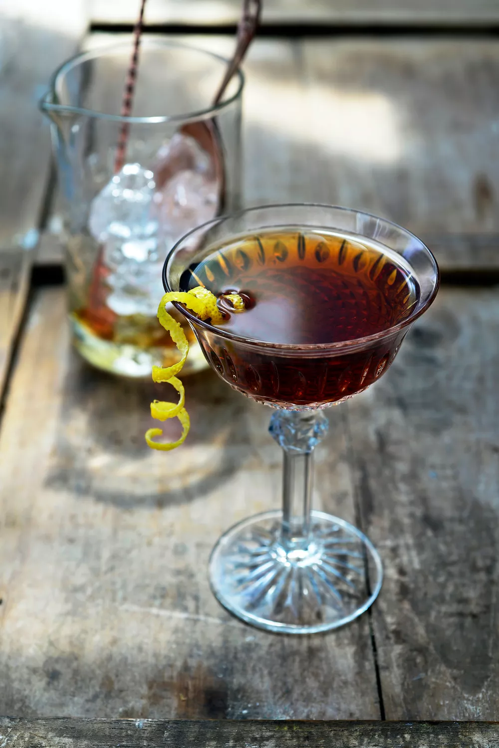 Zeef de cocktail in een ijskoude coupette en werk af met een zeste van citroen.