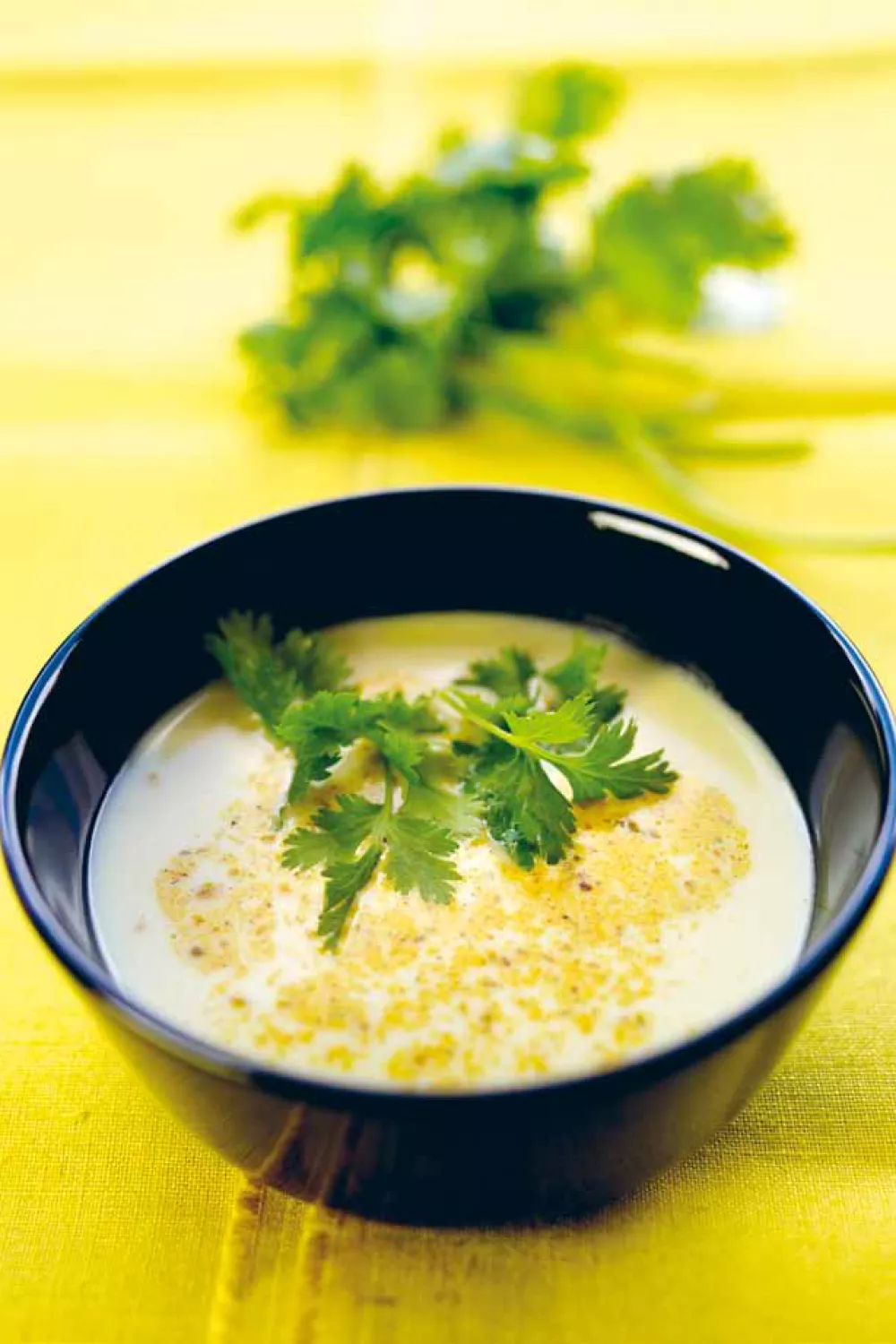 Snij de banaan, ui, prei, koriander, knoflook en gember in kleine stukjes. Stoof alles aan in wat boter en giet er dan de kippenbouillon en de kokosmelk over. Laat dit een halfuurtje koken en mix. Kruid met currypoeder en peper en zout.