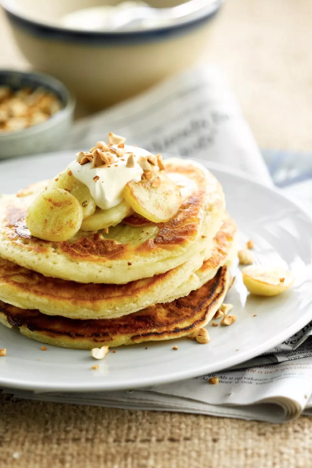 Luchtige bananenpannenkoekjes met kaneel en geroosterde cashewnoten zijn perfect voor een ontspannen ontbijt of gezellige brunch. Het smeuïge beslag van bloem, melk en eieren krijgt extra zoetheid door plakjes banaan die tijdens het bakken in de pannenkoek worden gelegd. Serveer met Griekse yoghurt of zure room voor frisheid en strooi er extra noten over voor een knapperige bite.